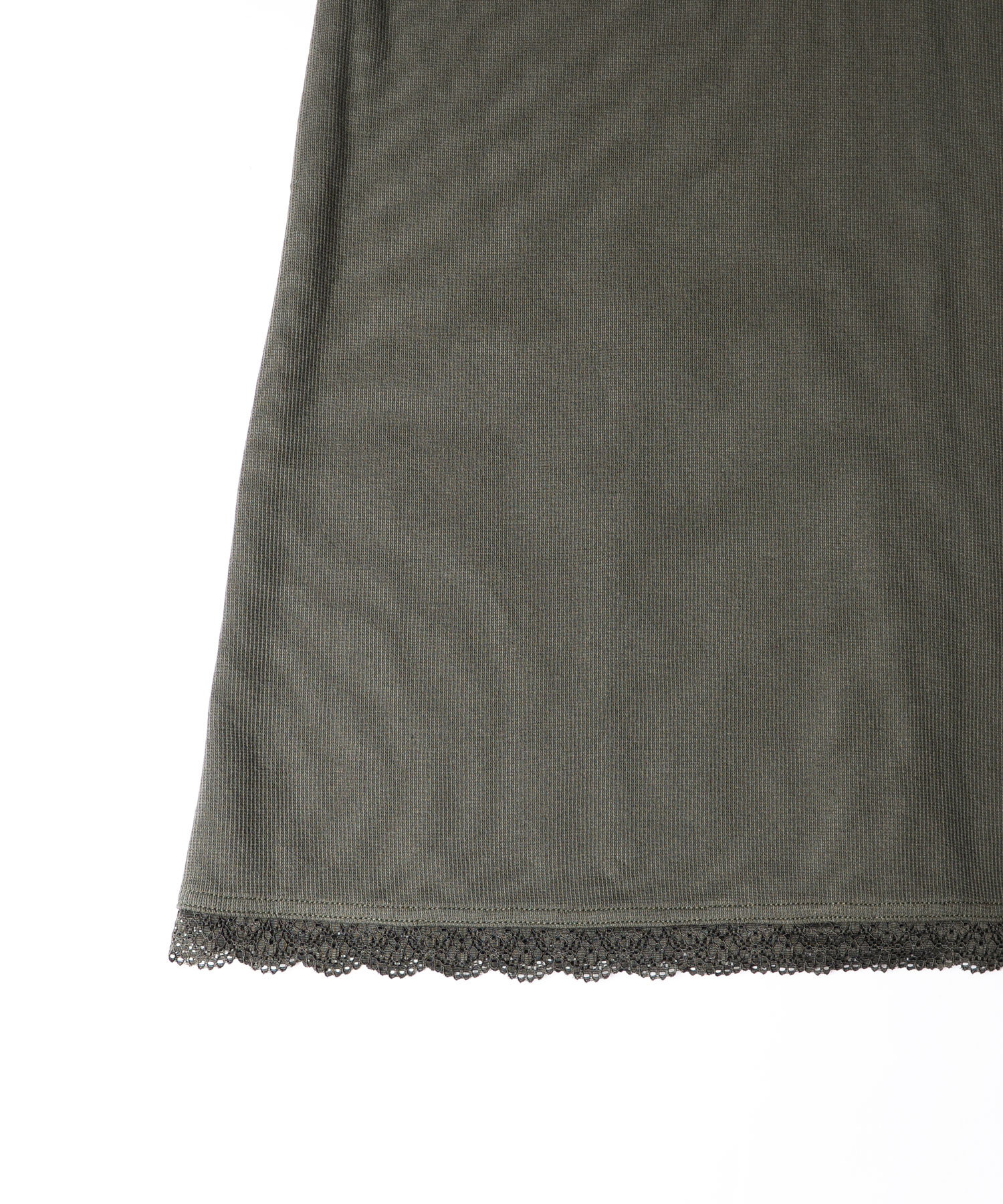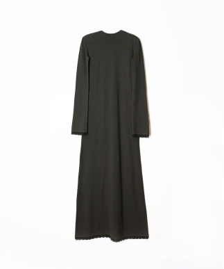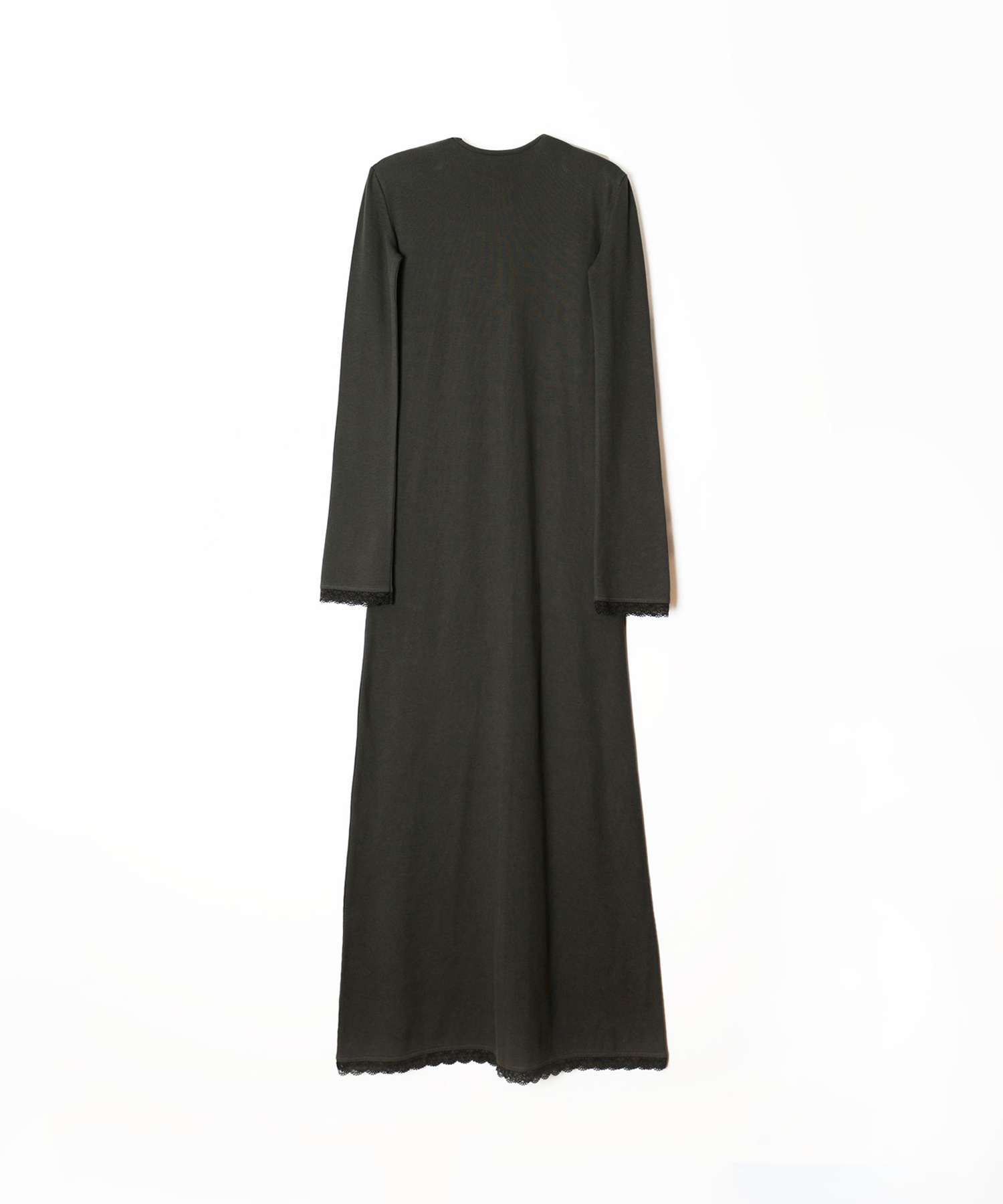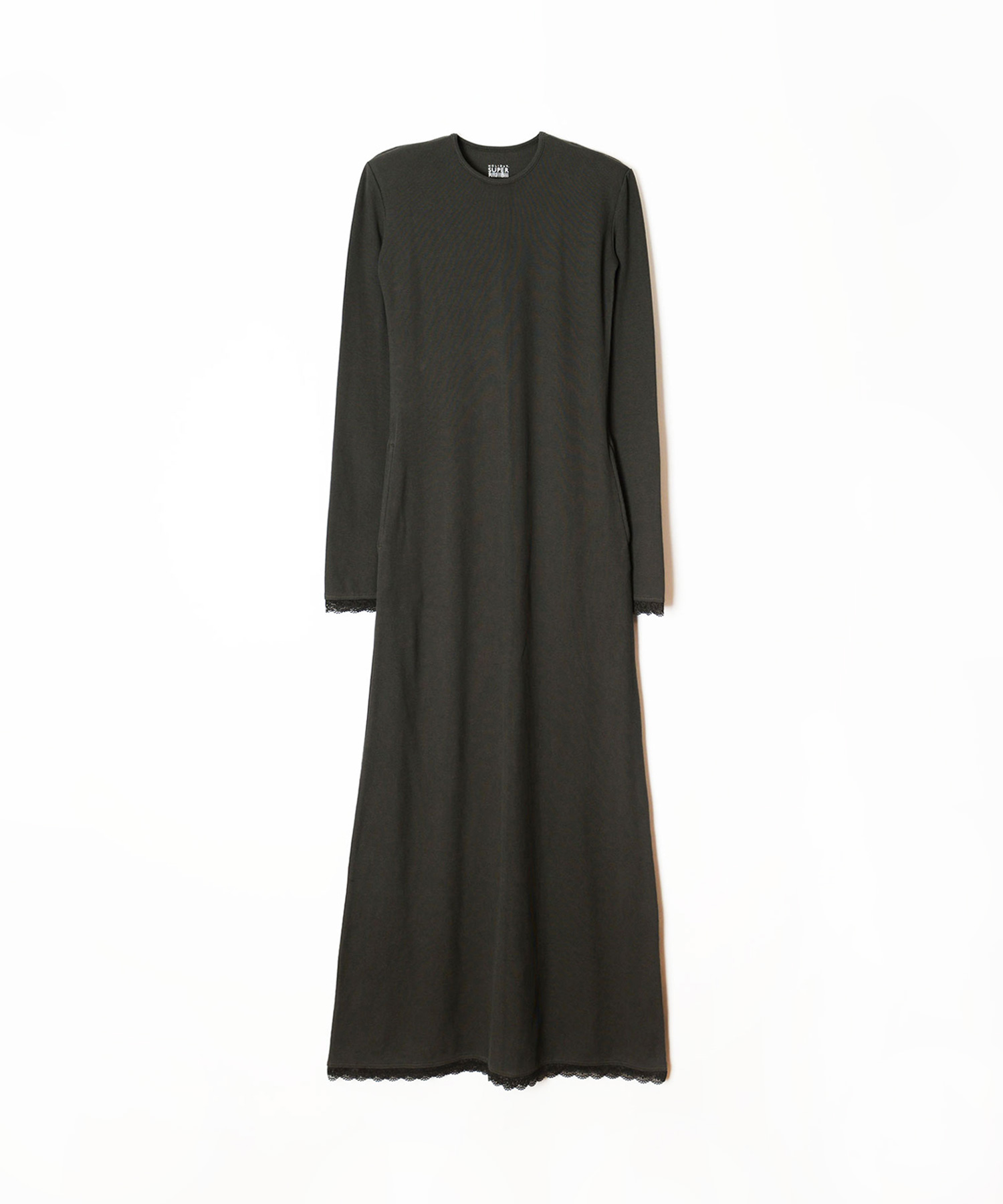 ソフトで着心地の良い【SUPER RIB】L/Sドレス。肩パッドの入った立体的なショルダーが印象的。袖はフレアで長めの仕様です。裾と袖口にあしらったレースがポイント。サイドポケット付き。