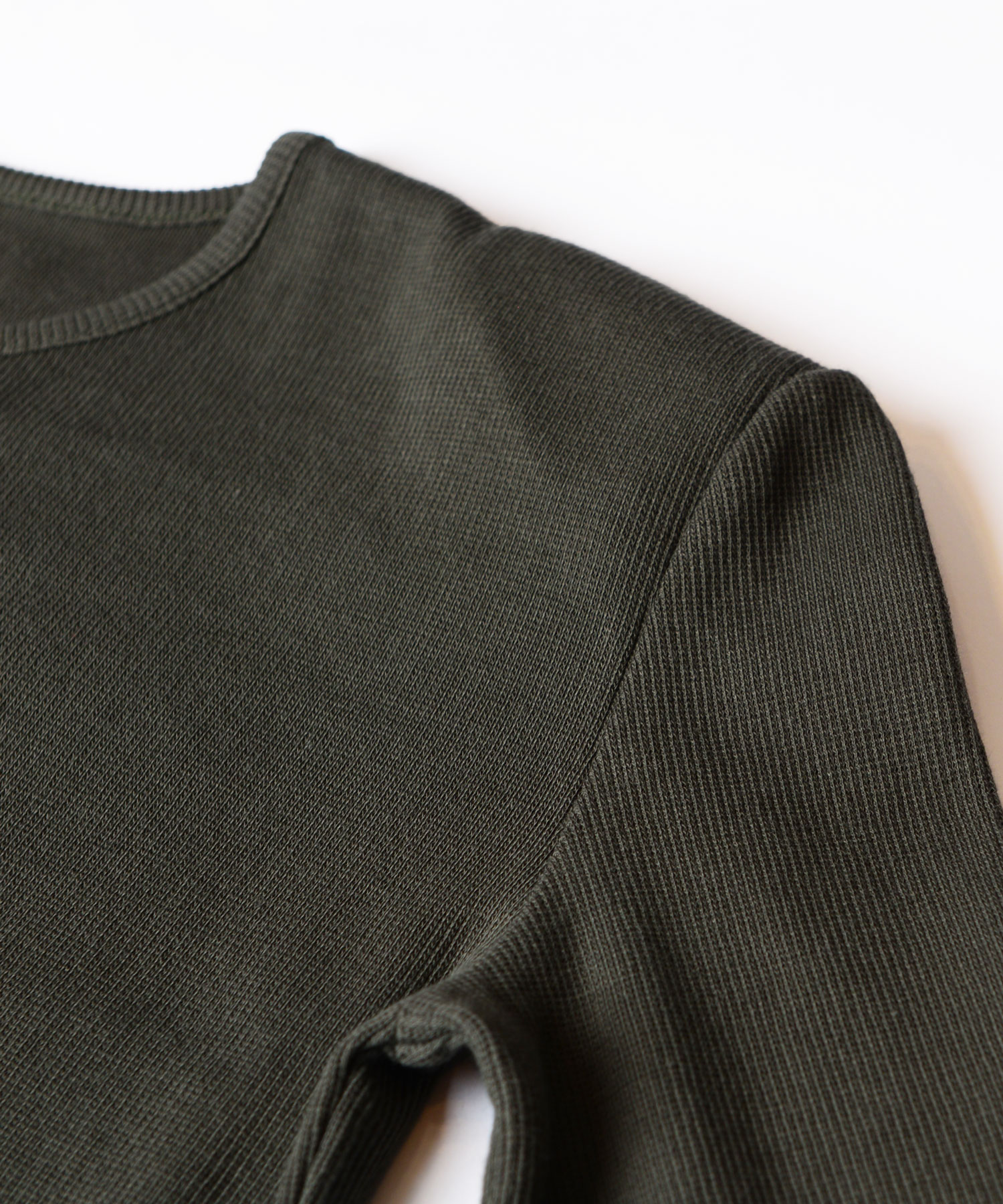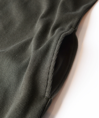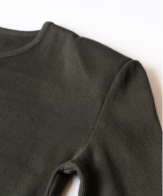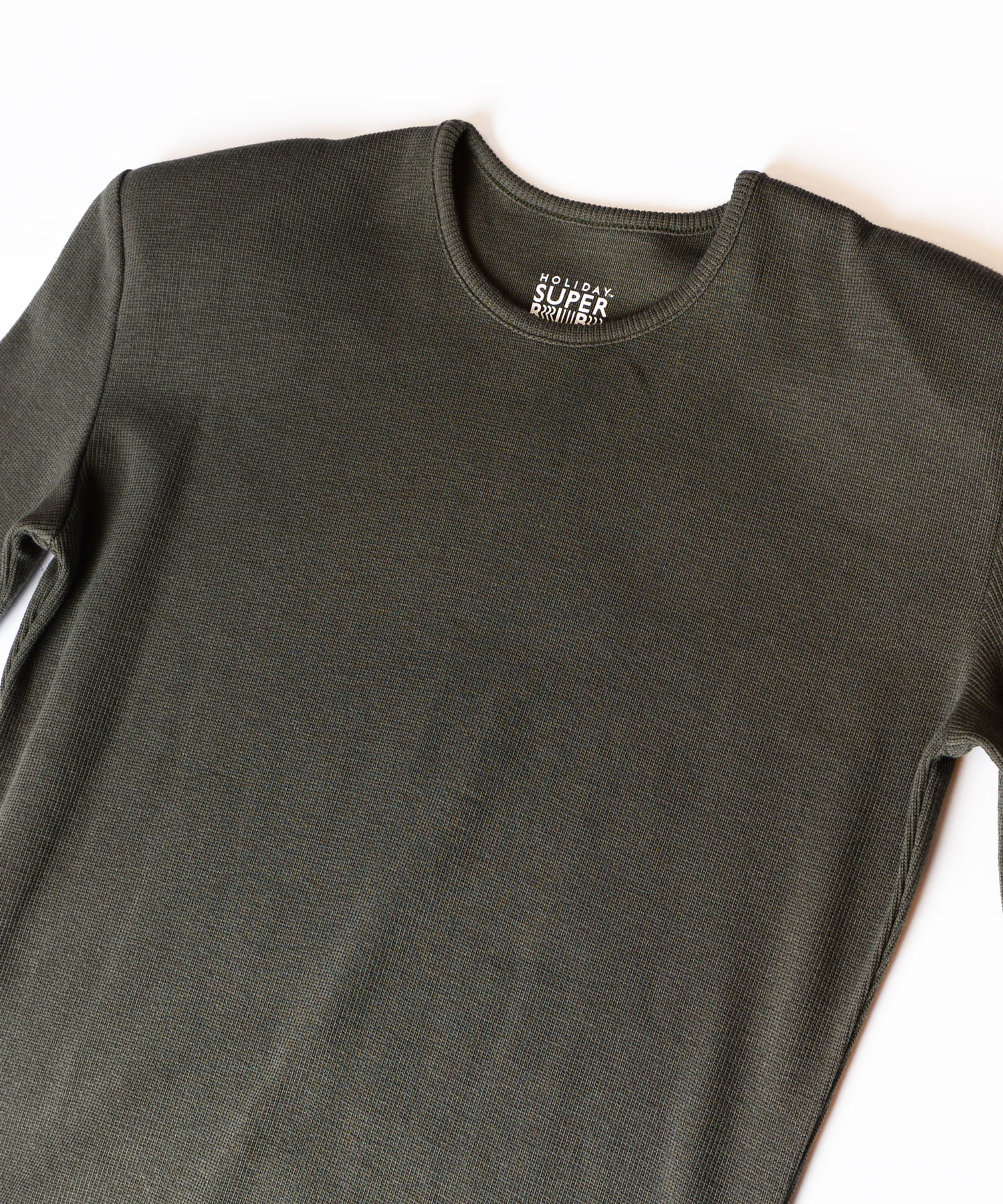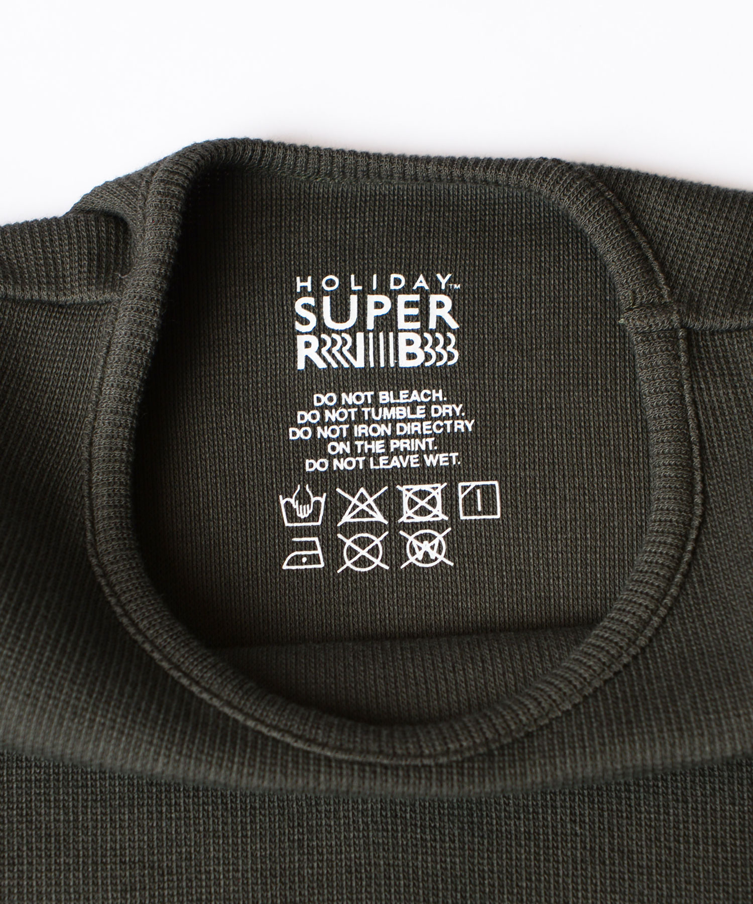 HOLIDAY オリジナルのカットソー素材 SUPER RIB。2026SPRINGよりアップデート。糸質を格段にレベルアップしたことにより毛羽立ちが少なく耐久性があり色褪せもしづらいのが特徴です。フィット感が増し着心地も抜群です。