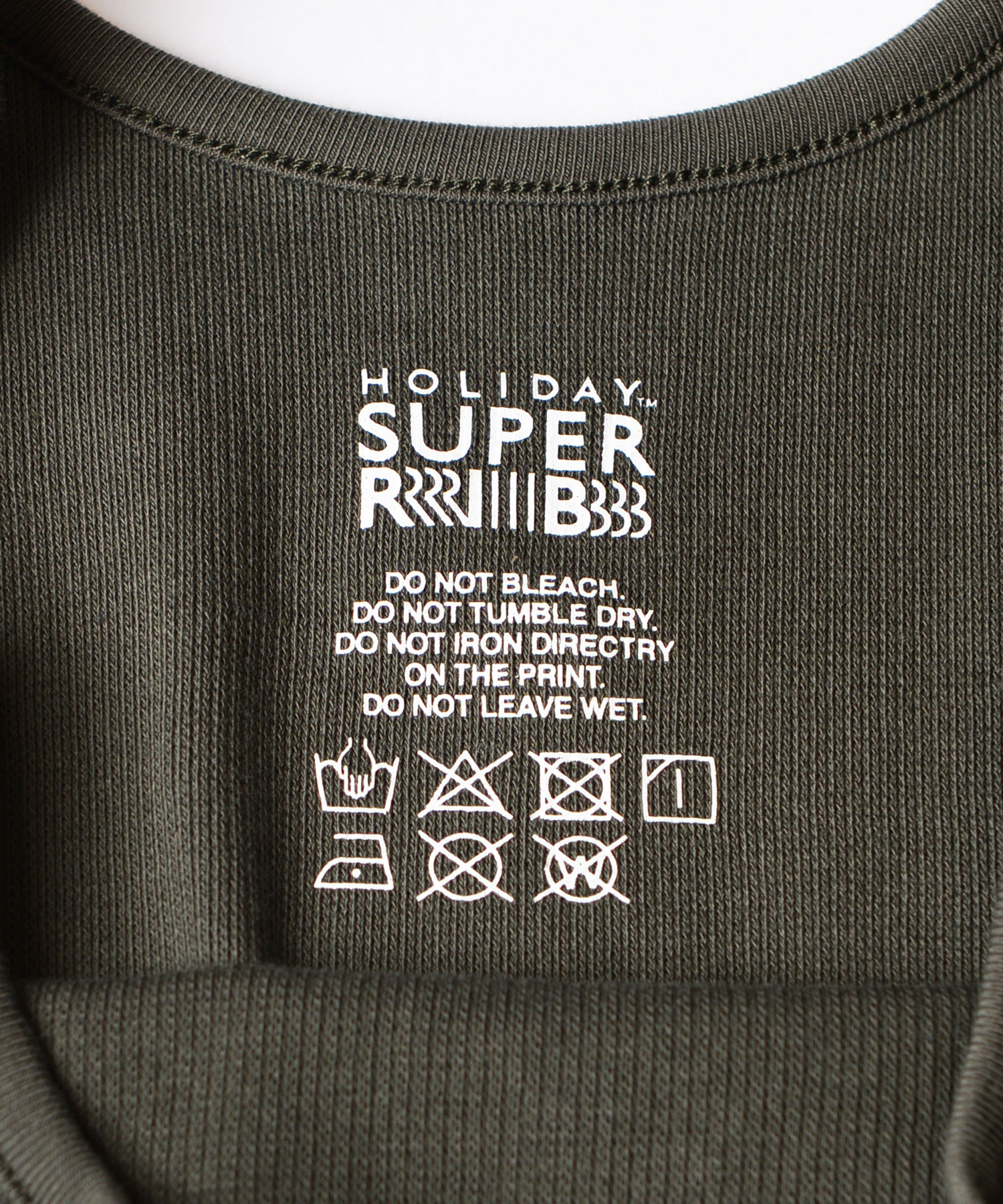 HOLIDAY オリジナルのカットソー素材 SUPER RIB。2026SPRINGよりアップデート。糸質を格段にレベルアップしたことにより毛羽立ちが少なく耐久性があり色褪せもしづらいのが特徴です。フィット感が増し着心地も抜群です。