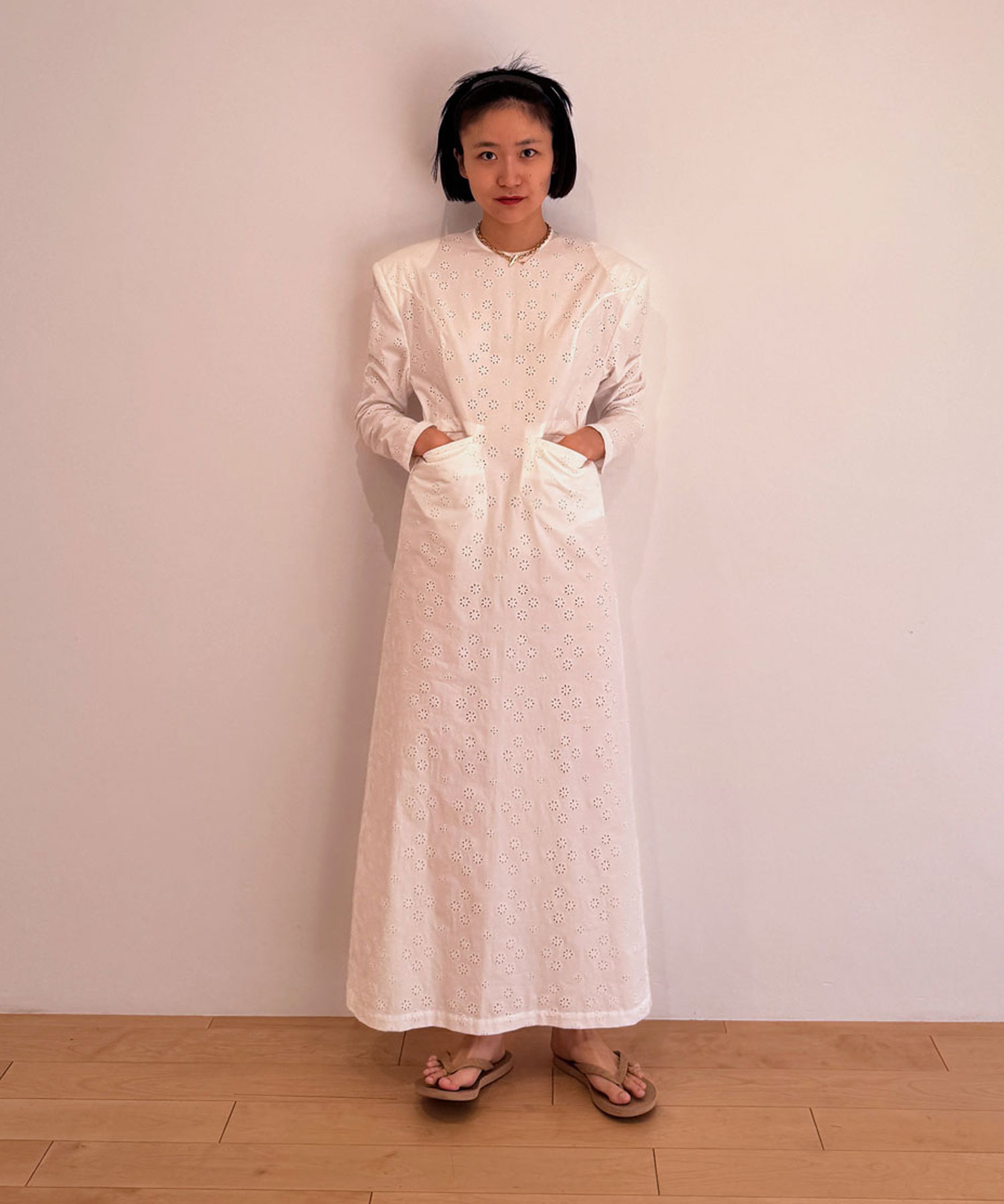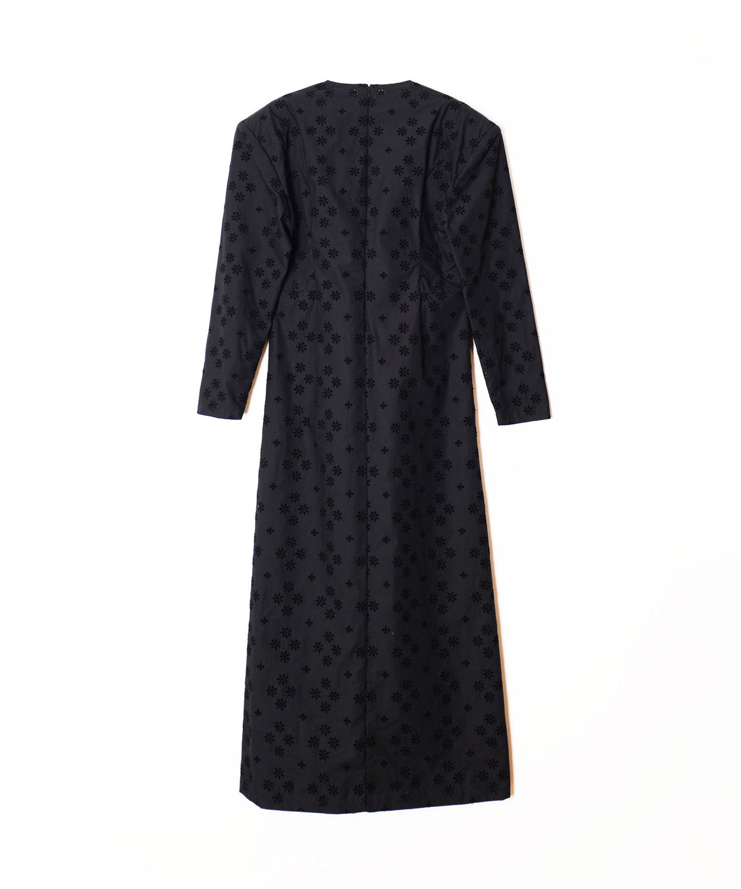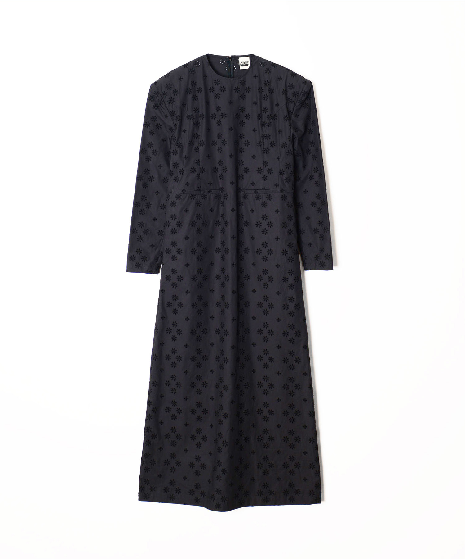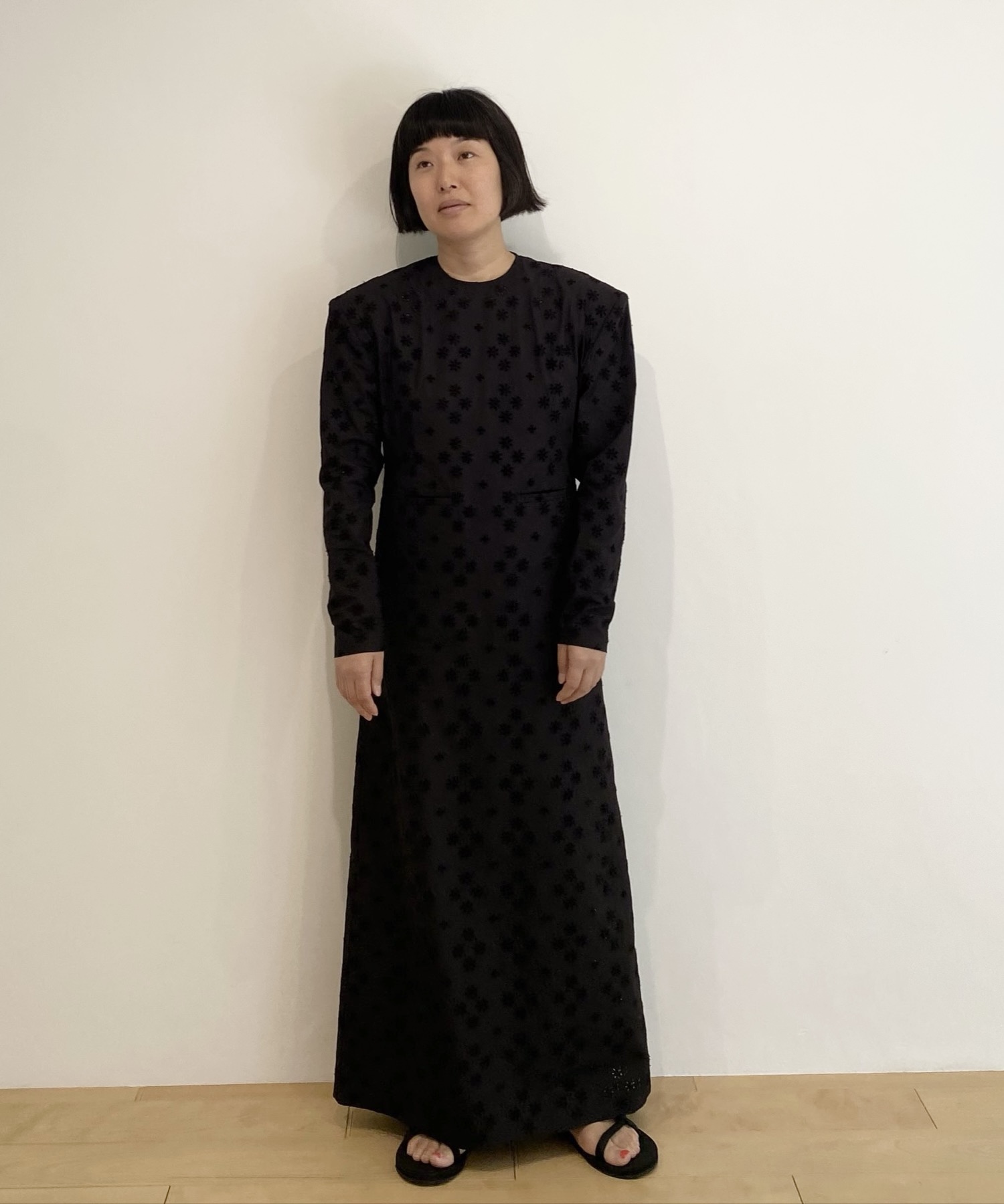 コットンタイプライター生地に花柄を繊細に刺繍したエンブロイダリーレースのロングドレス。オリジナルのフラワーパターンレース。肩パッドの入った立体的なショルダーが印象的。フロントポケット付き。