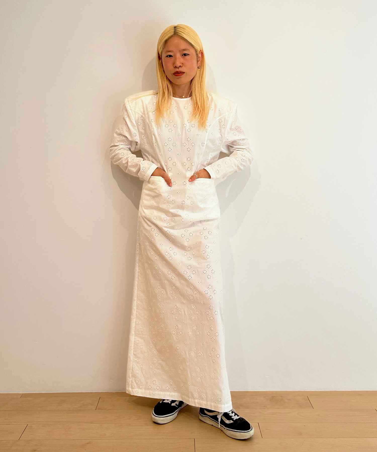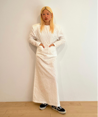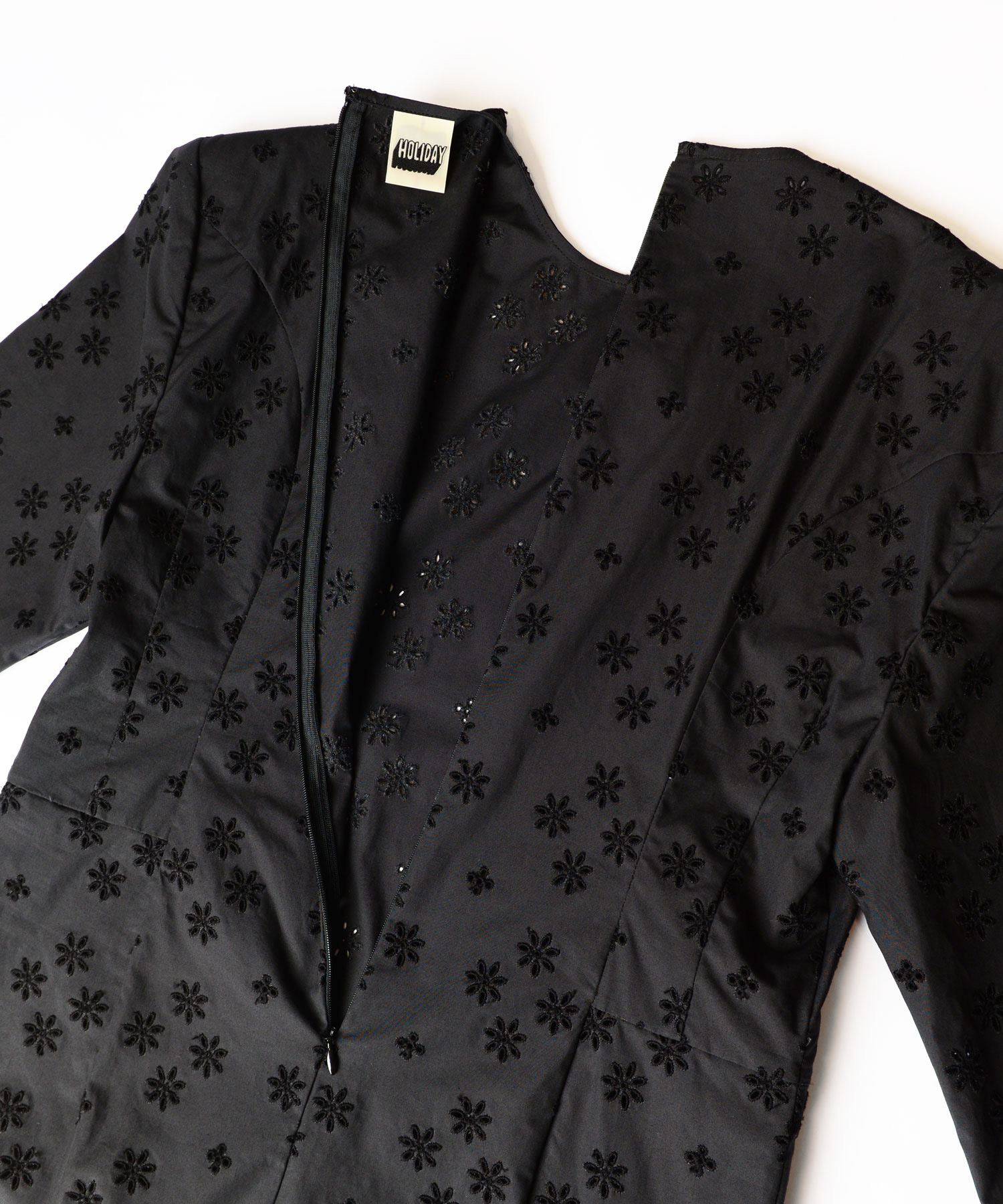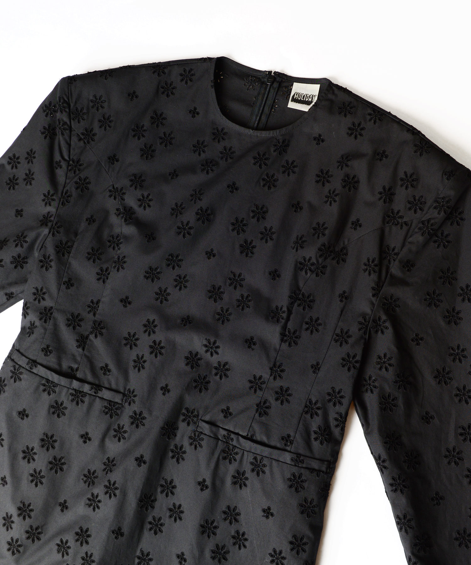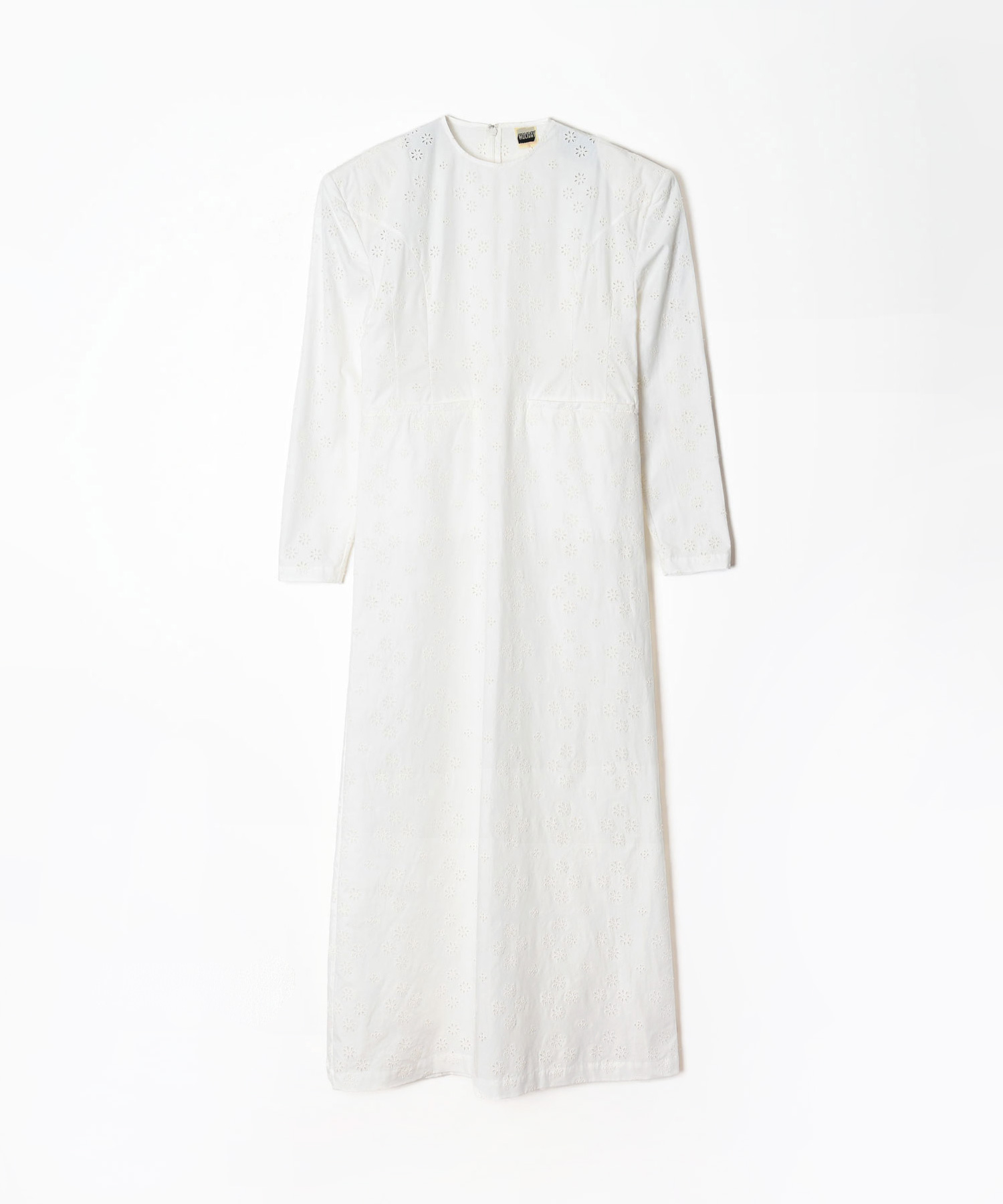 コットンタイプライター生地に花柄を繊細に刺繍したエンブロイダリーレースのロングドレス。オリジナルのフラワーパターンレース。肩パッドの入った立体的なショルダーが印象的。フロントポケット付き。