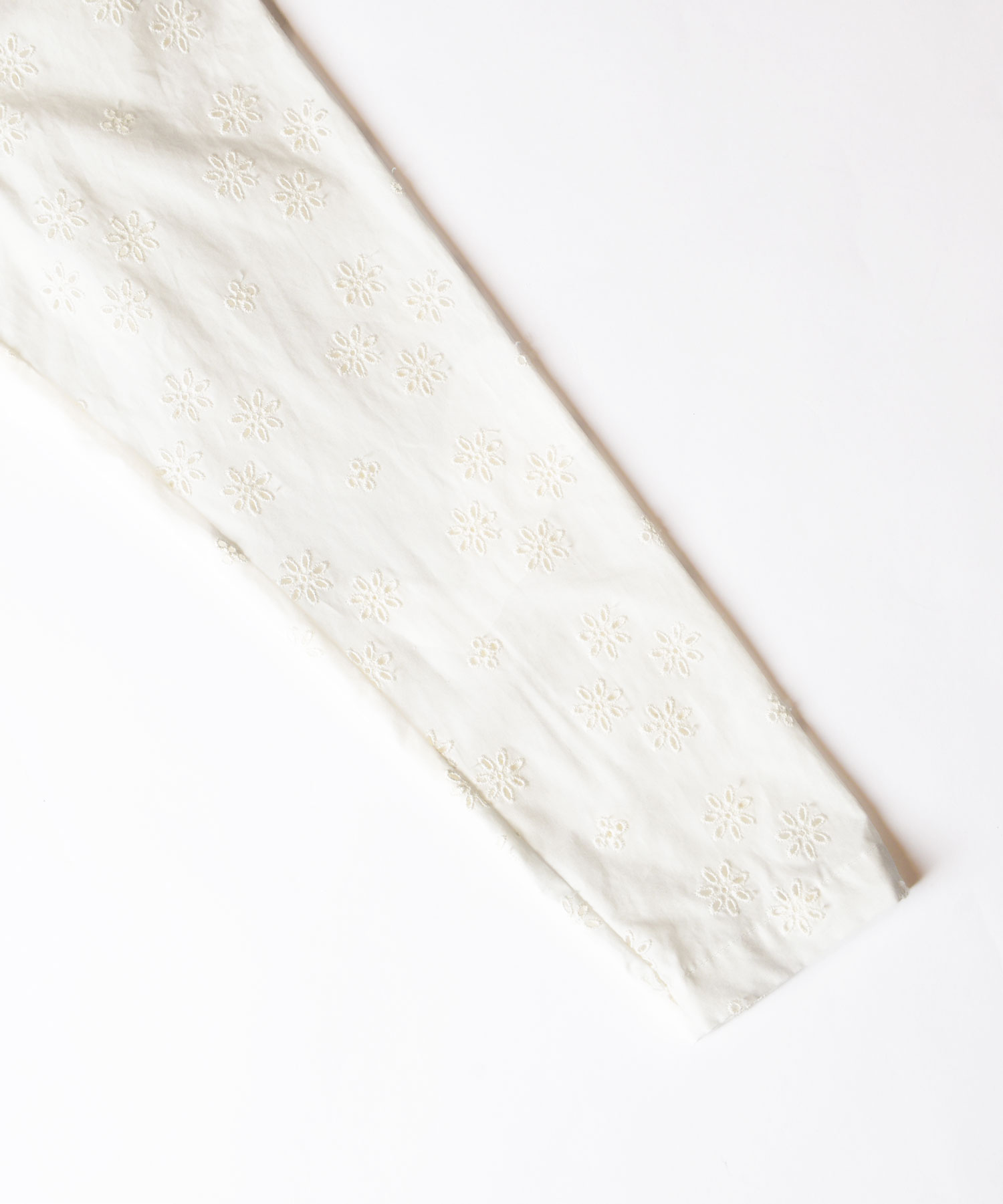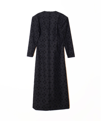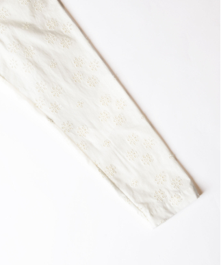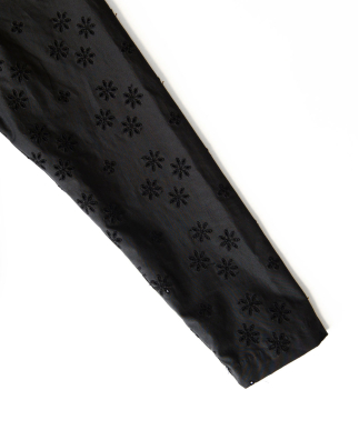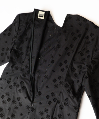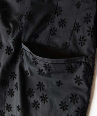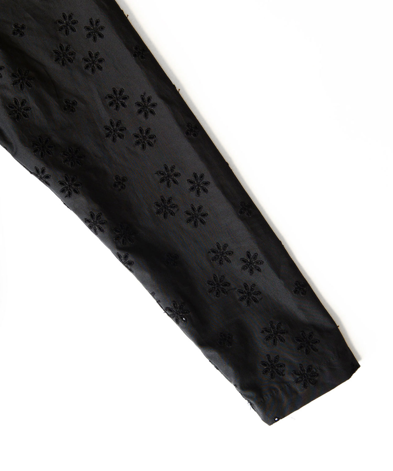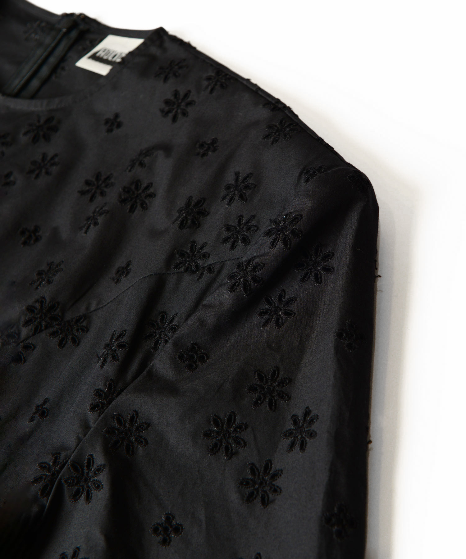 コットンタイプライター生地に花柄を繊細に刺繍したエンブロイダリーレースのロングドレス。オリジナルのフラワーパターンレース。肩パッドの入った立体的なショルダーが印象的。フロントポケット付き。