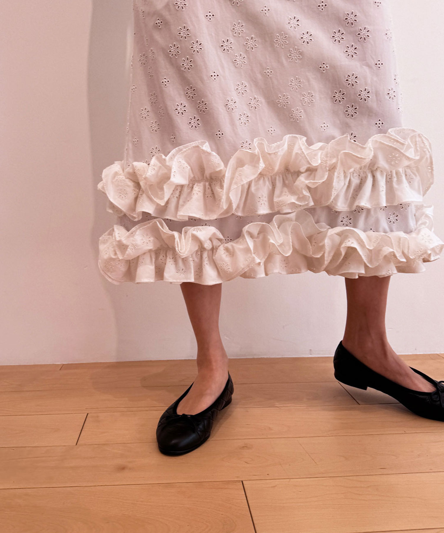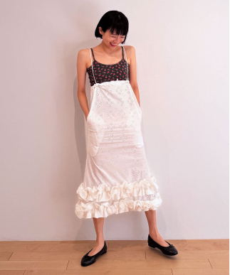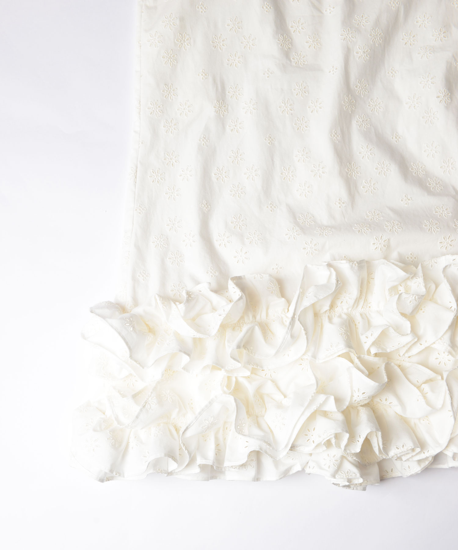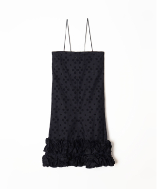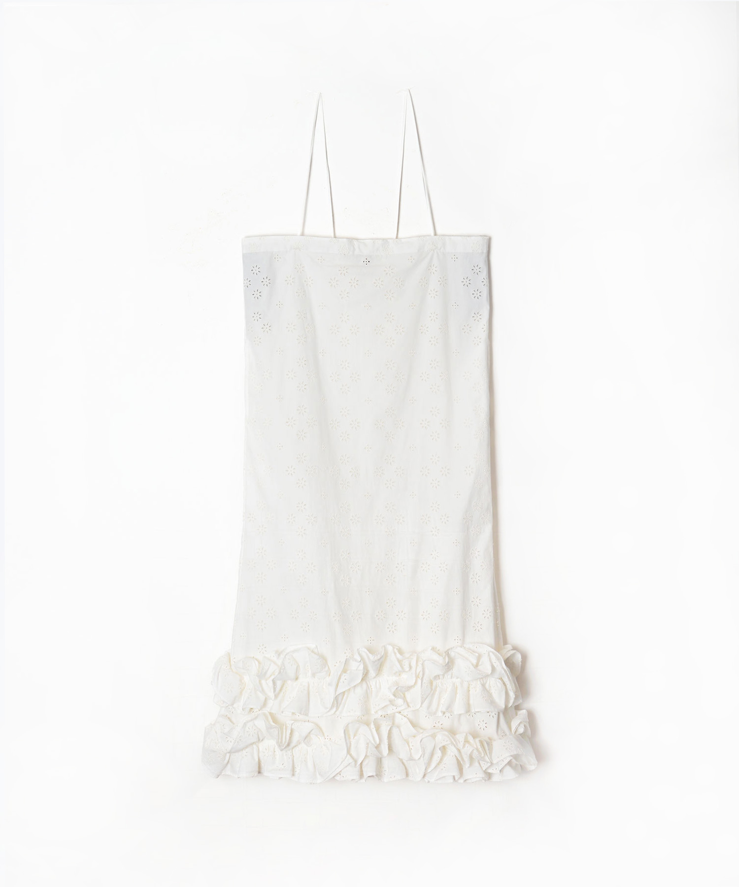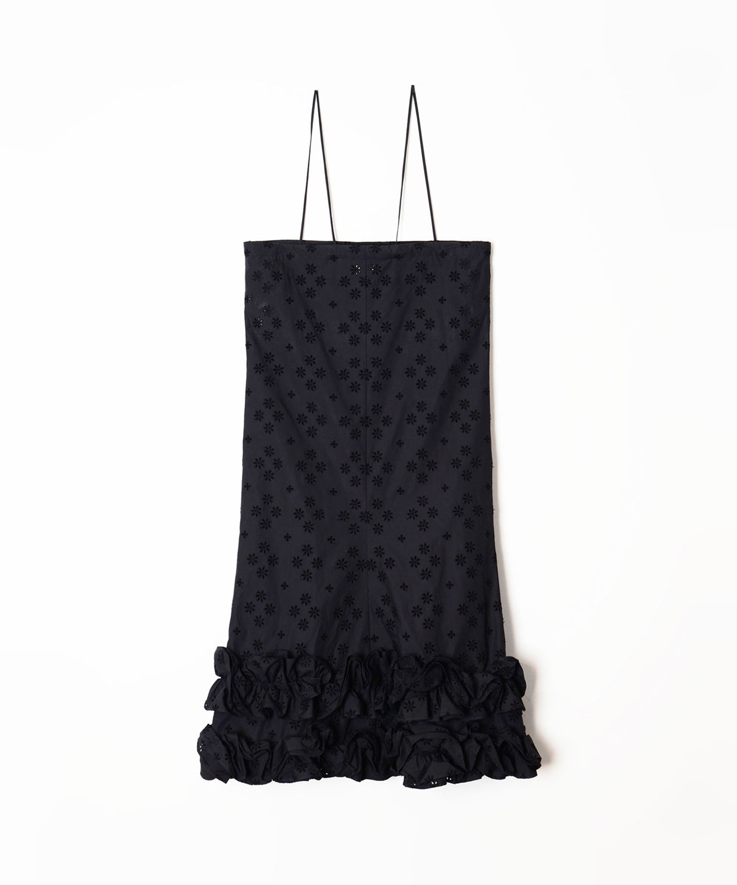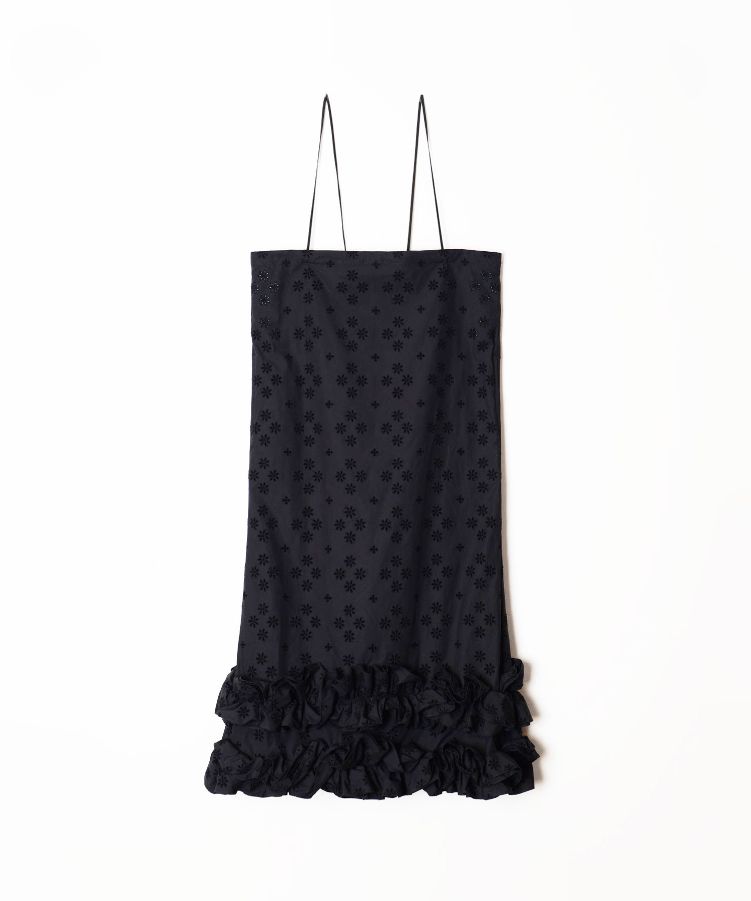 コットンタイプライター生地に花柄を繊細に刺繍したエンブロイダリーレースのストラップドレス。オリジナルのフラワーパターンレース。裾にあしらった2段の立体的でボリュームのあるラッフルがポイント。ストラップを使ってキャミソールドレスやフロントのリボンを絞ってスカートとして着用することもできます。サイドポケット付き。