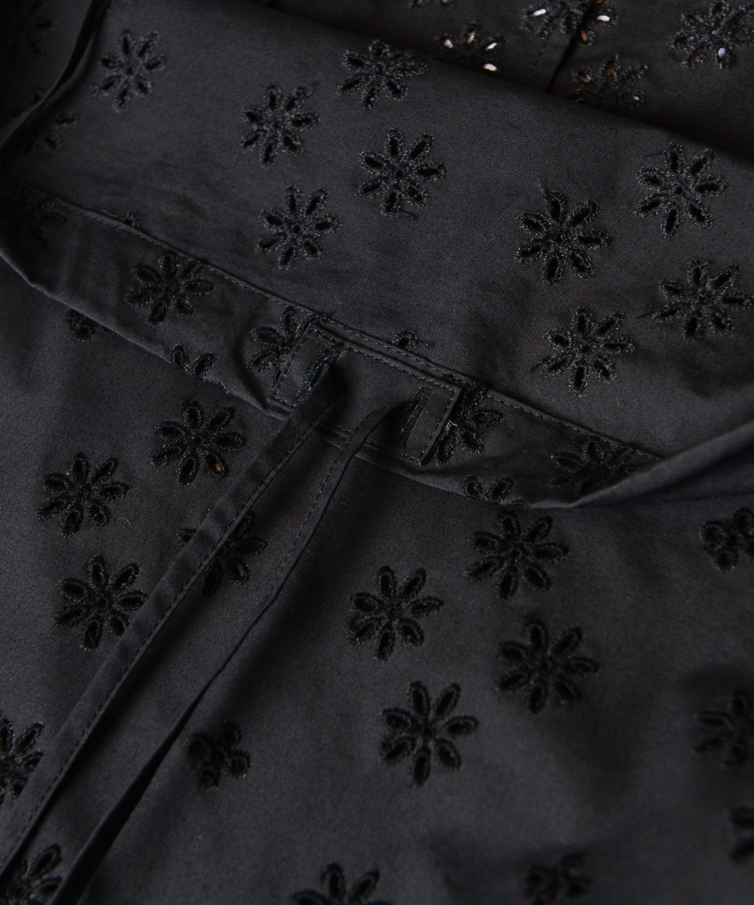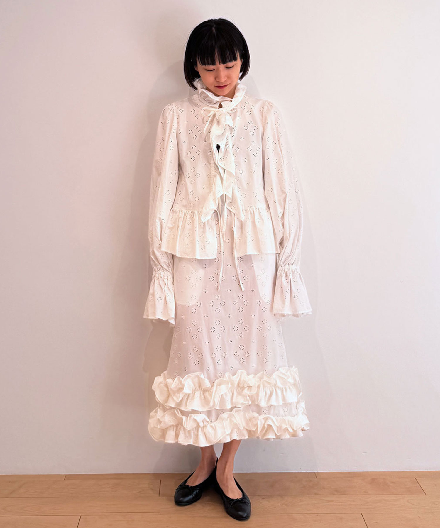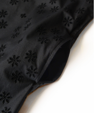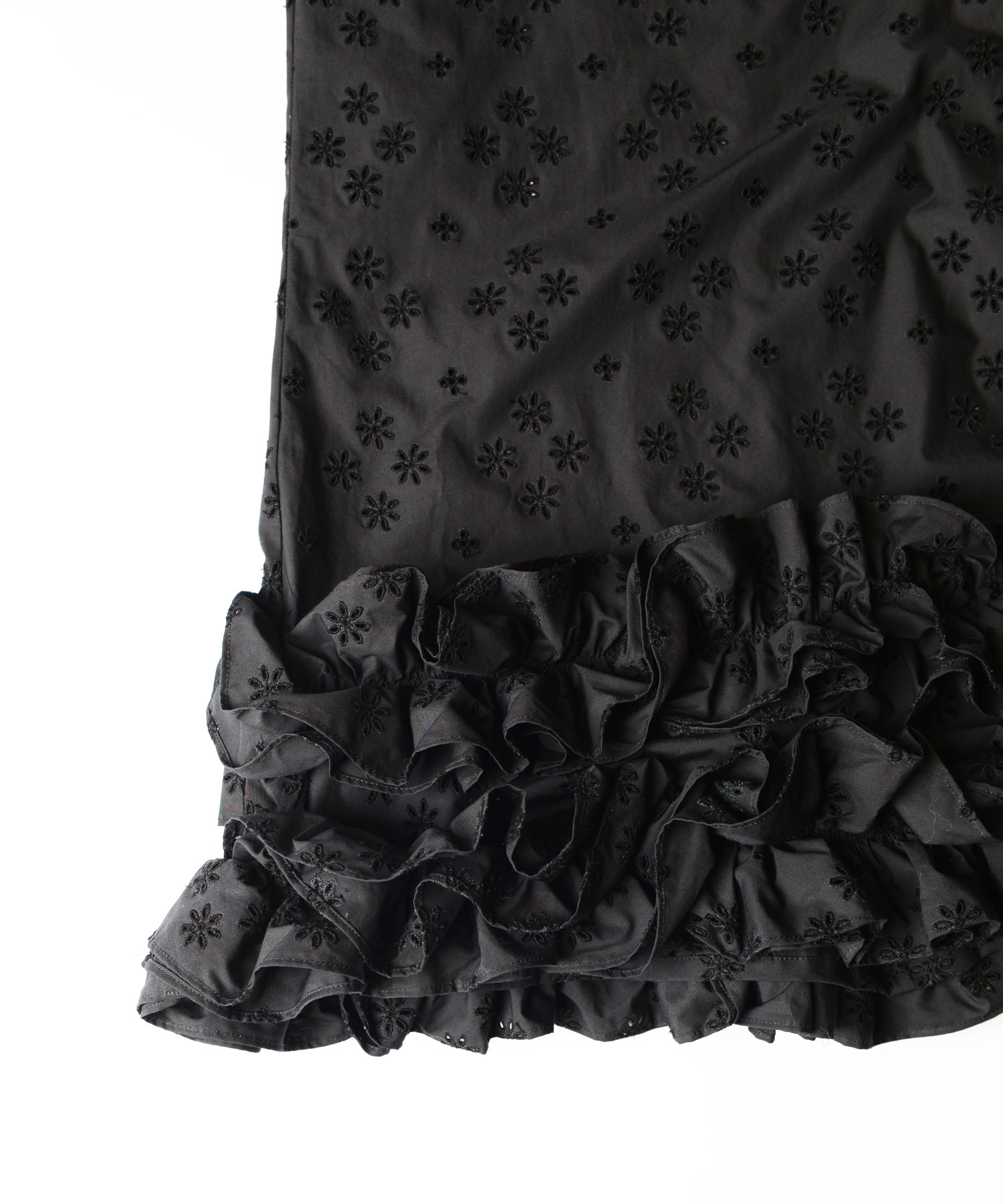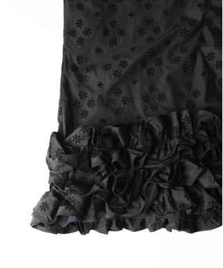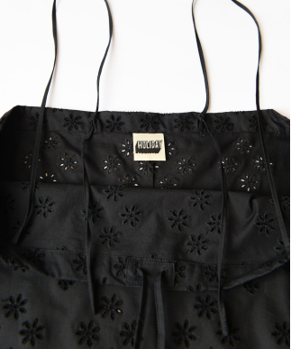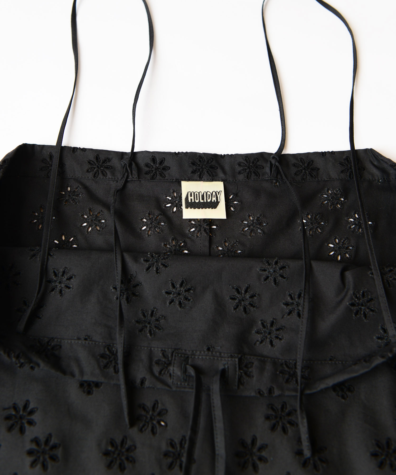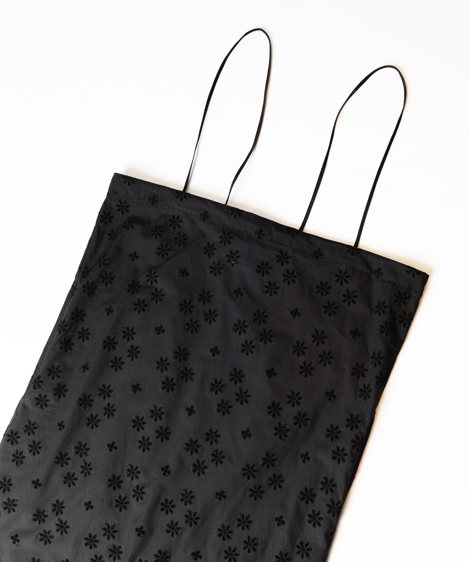 コットンタイプライター生地に花柄を繊細に刺繍したエンブロイダリーレースのストラップドレス。オリジナルのフラワーパターンレース。裾にあしらった2段の立体的でボリュームのあるラッフルがポイント。ストラップを使ってキャミソールドレスやフロントのリボンを絞ってスカートとして着用することもできます。サイドポケット付き。