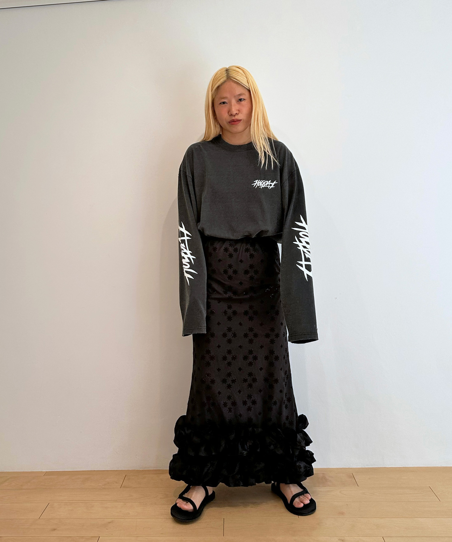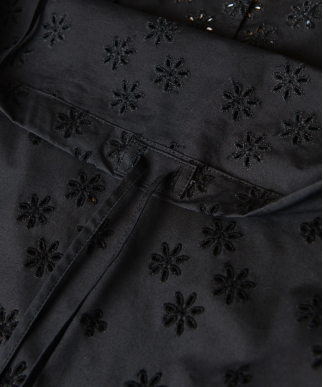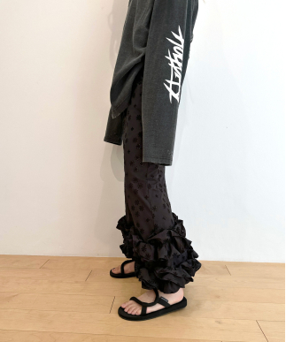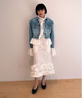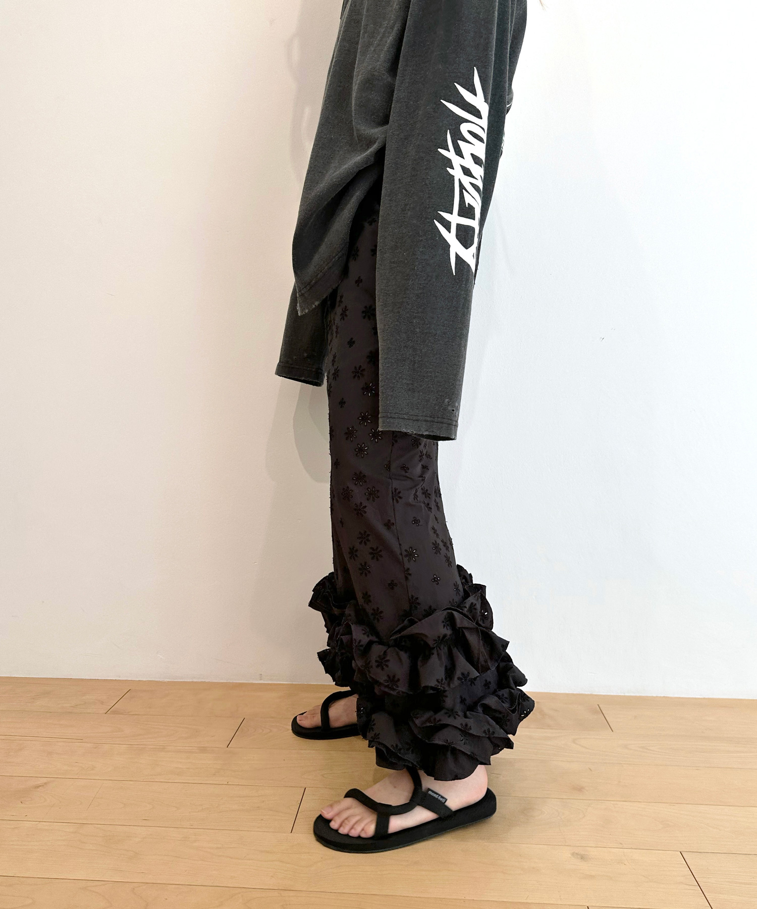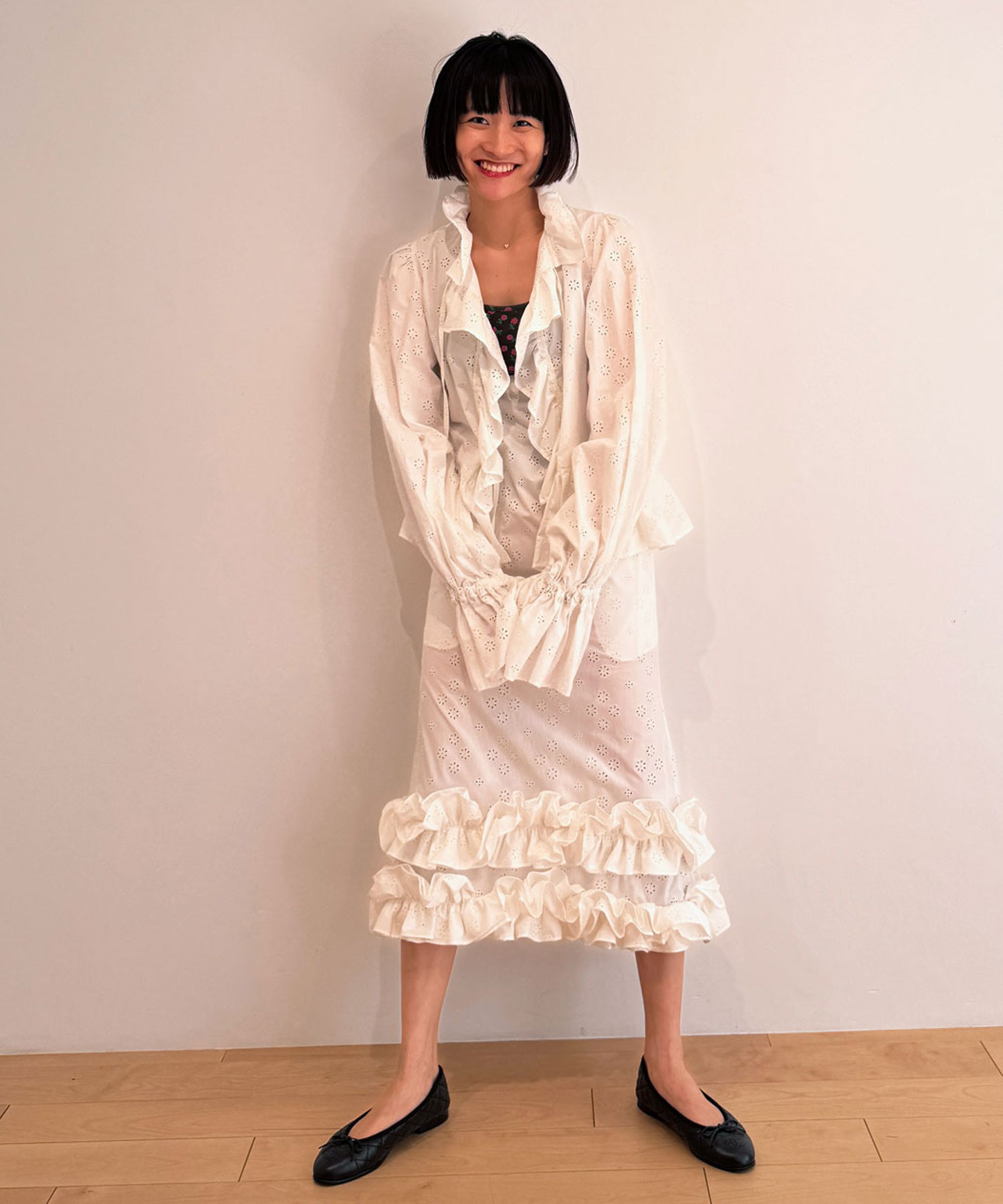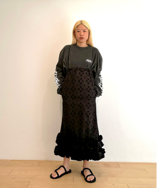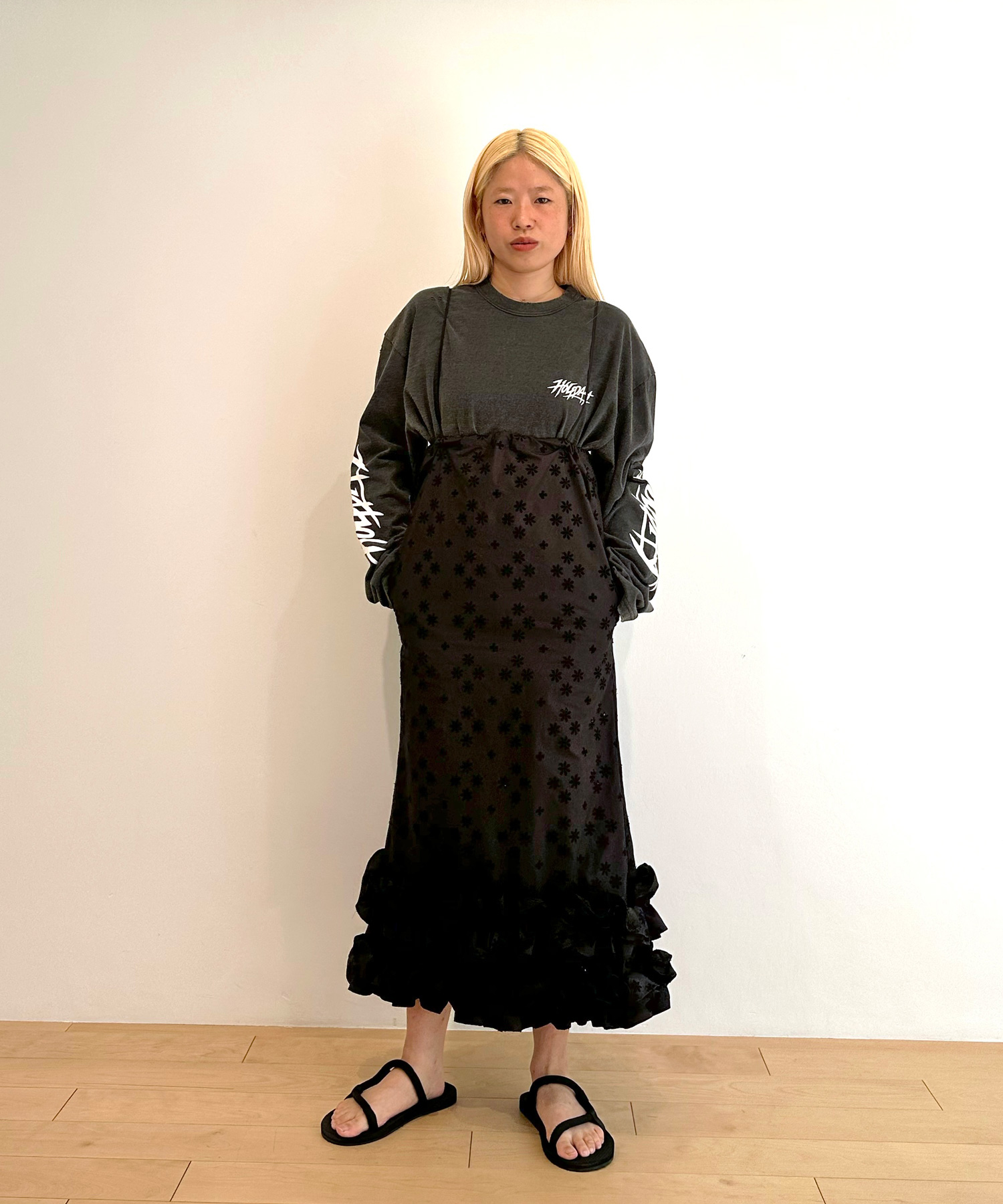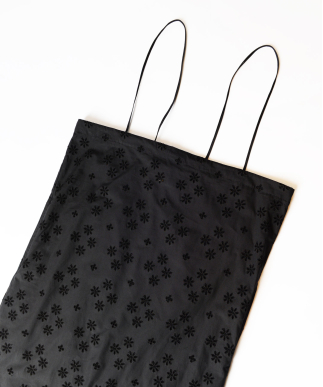 コットンタイプライター生地に花柄を繊細に刺繍したエンブロイダリーレースのストラップドレス。オリジナルのフラワーパターンレース。裾にあしらった2段の立体的でボリュームのあるラッフルがポイント。ストラップを使ってキャミソールドレスやフロントのリボンを絞ってスカートとして着用することもできます。サイドポケット付き。