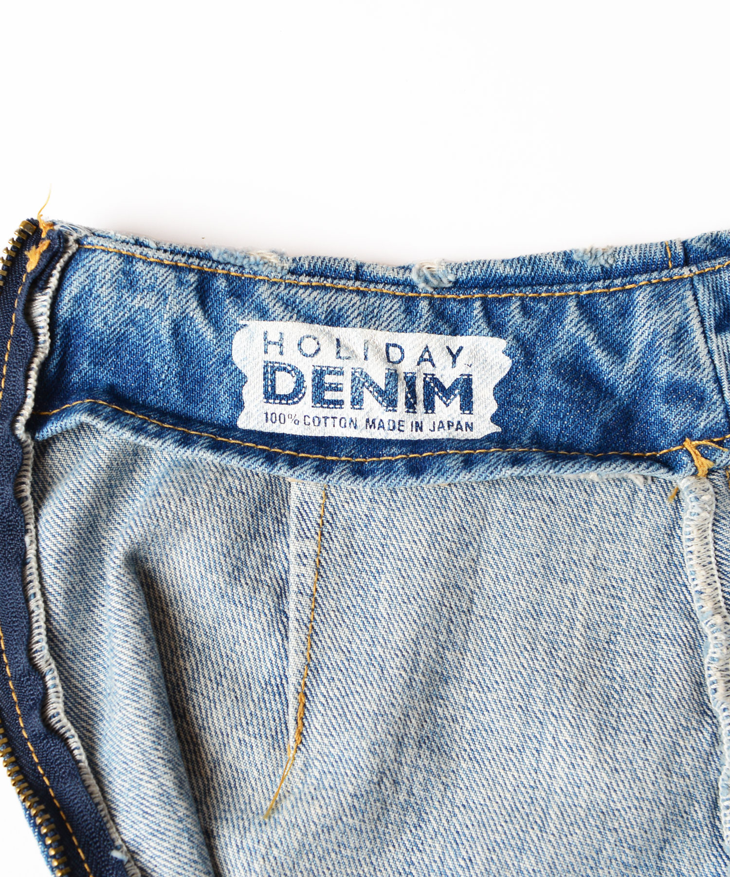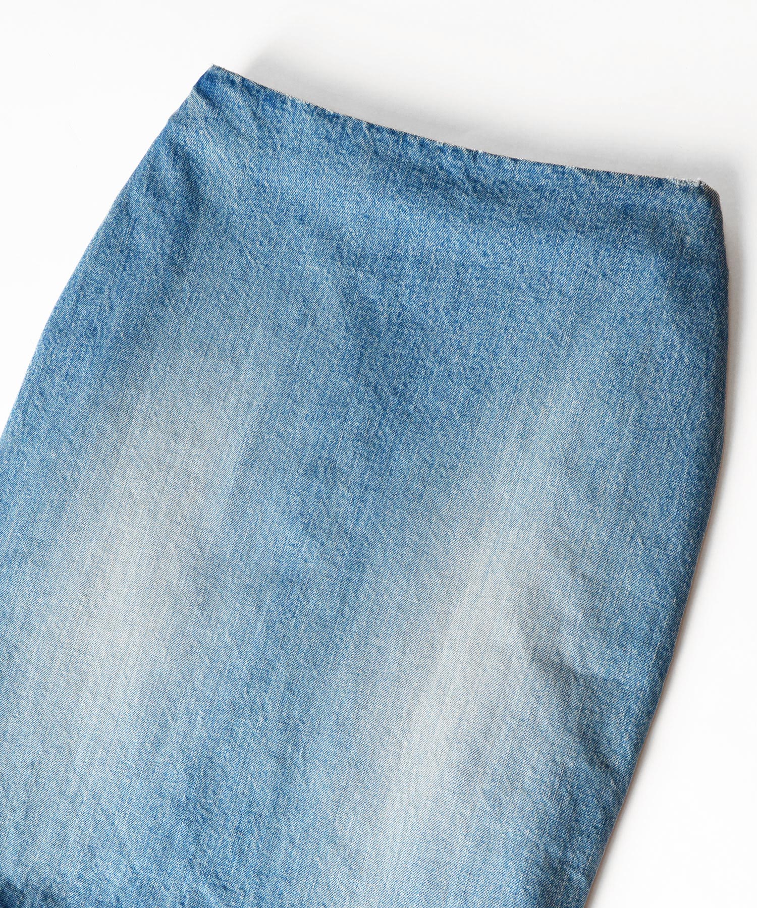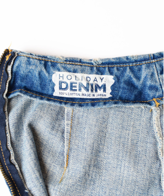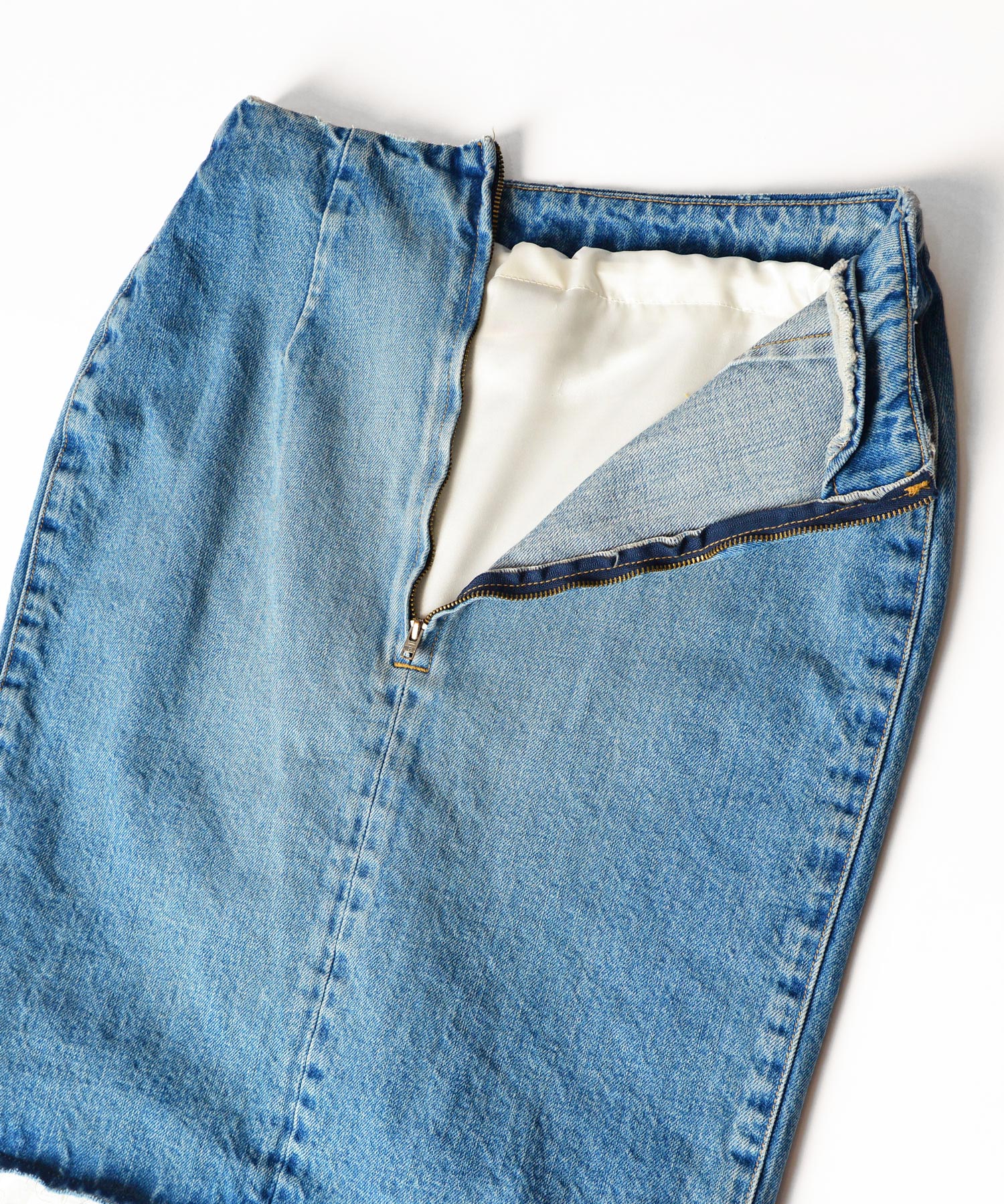 ムラ感のある12ozセルビッジデニムを使用したミディアム丈のスカート。長年着古したような風合いを出すため細部までこだわったリアルなヴィンテージ加工を施しています。生地、縫製、加工などすべての行程を岡山のデニム工場で行っています。