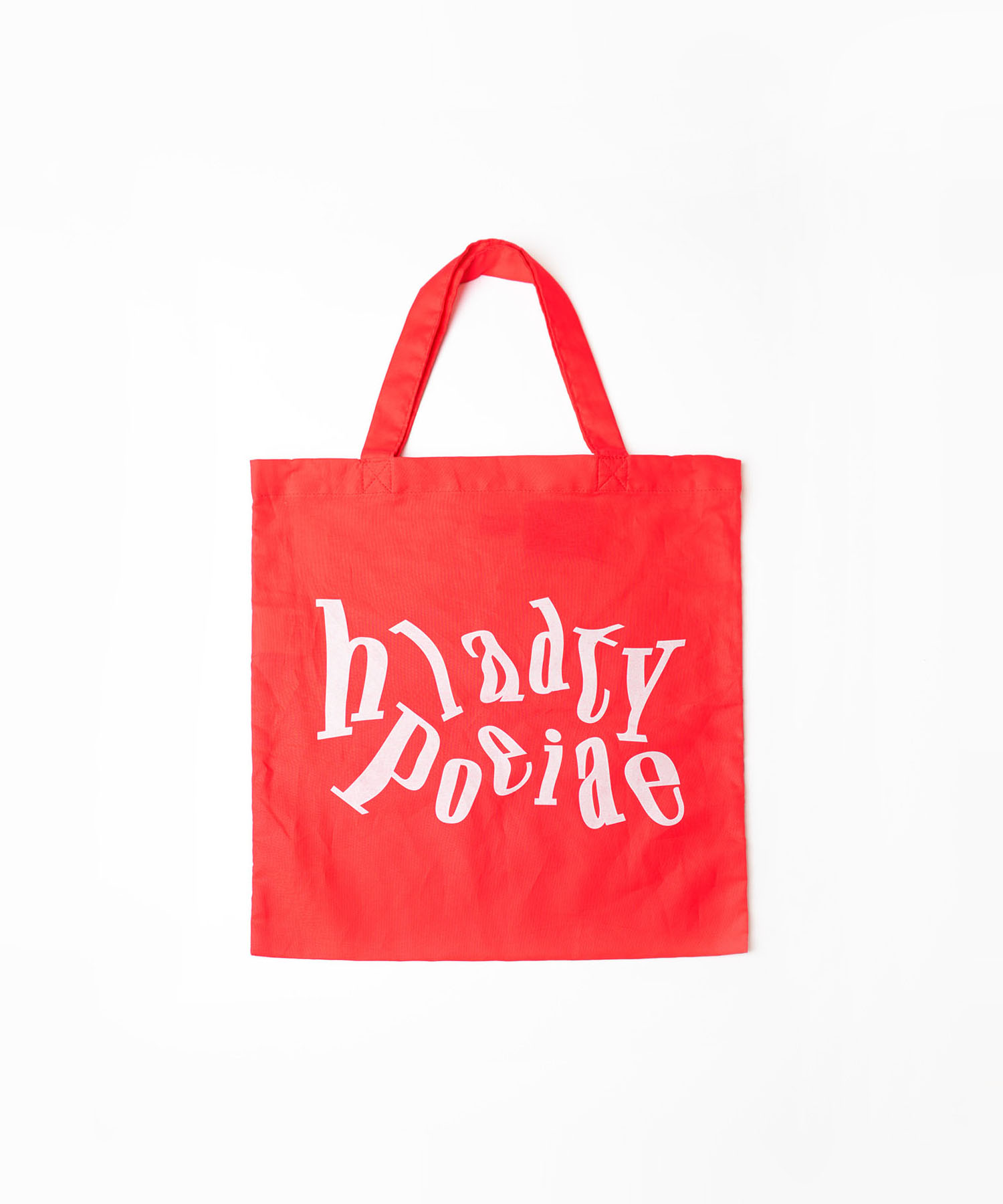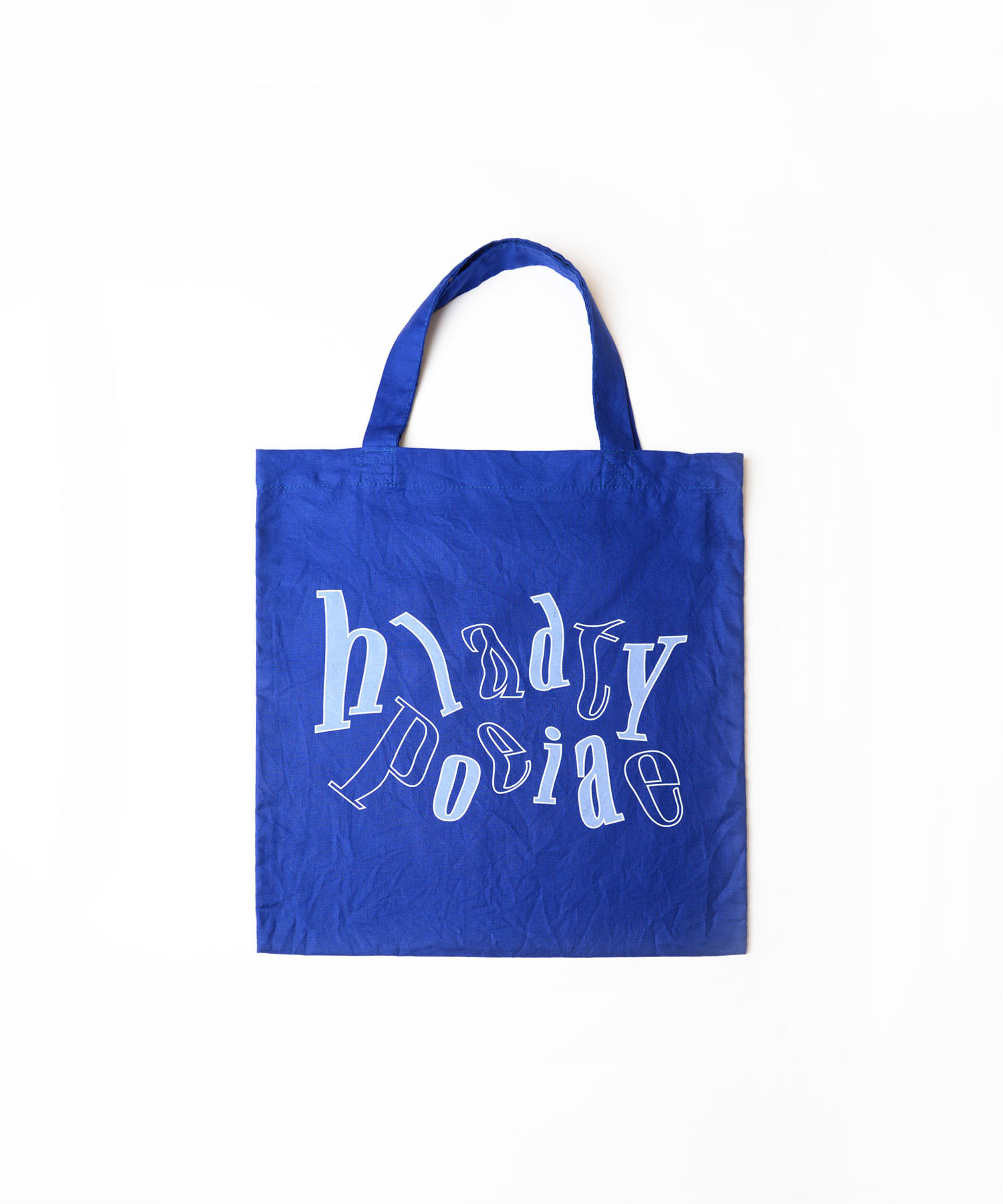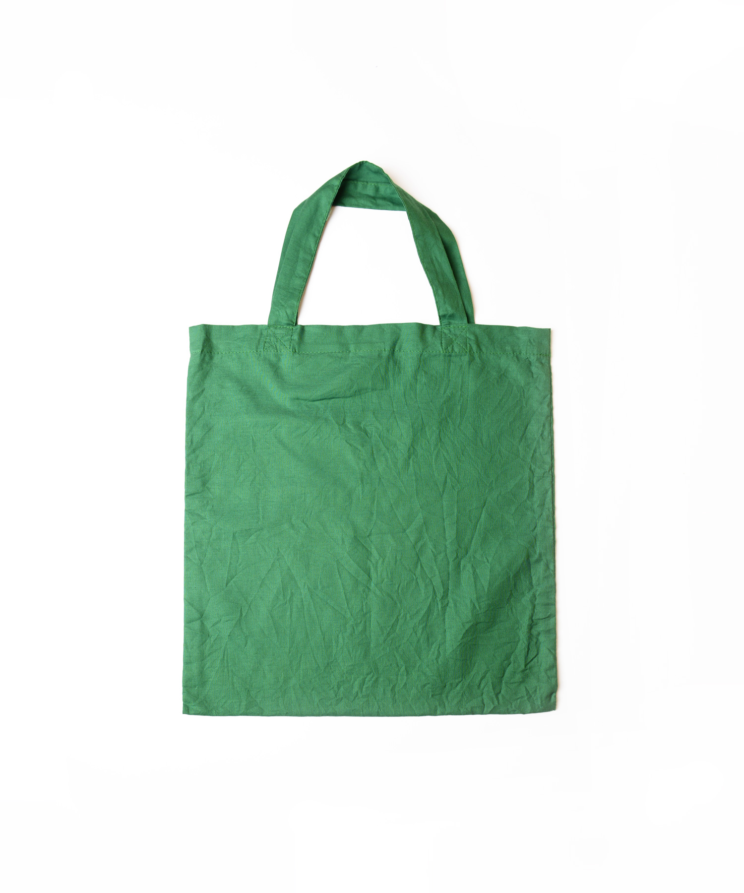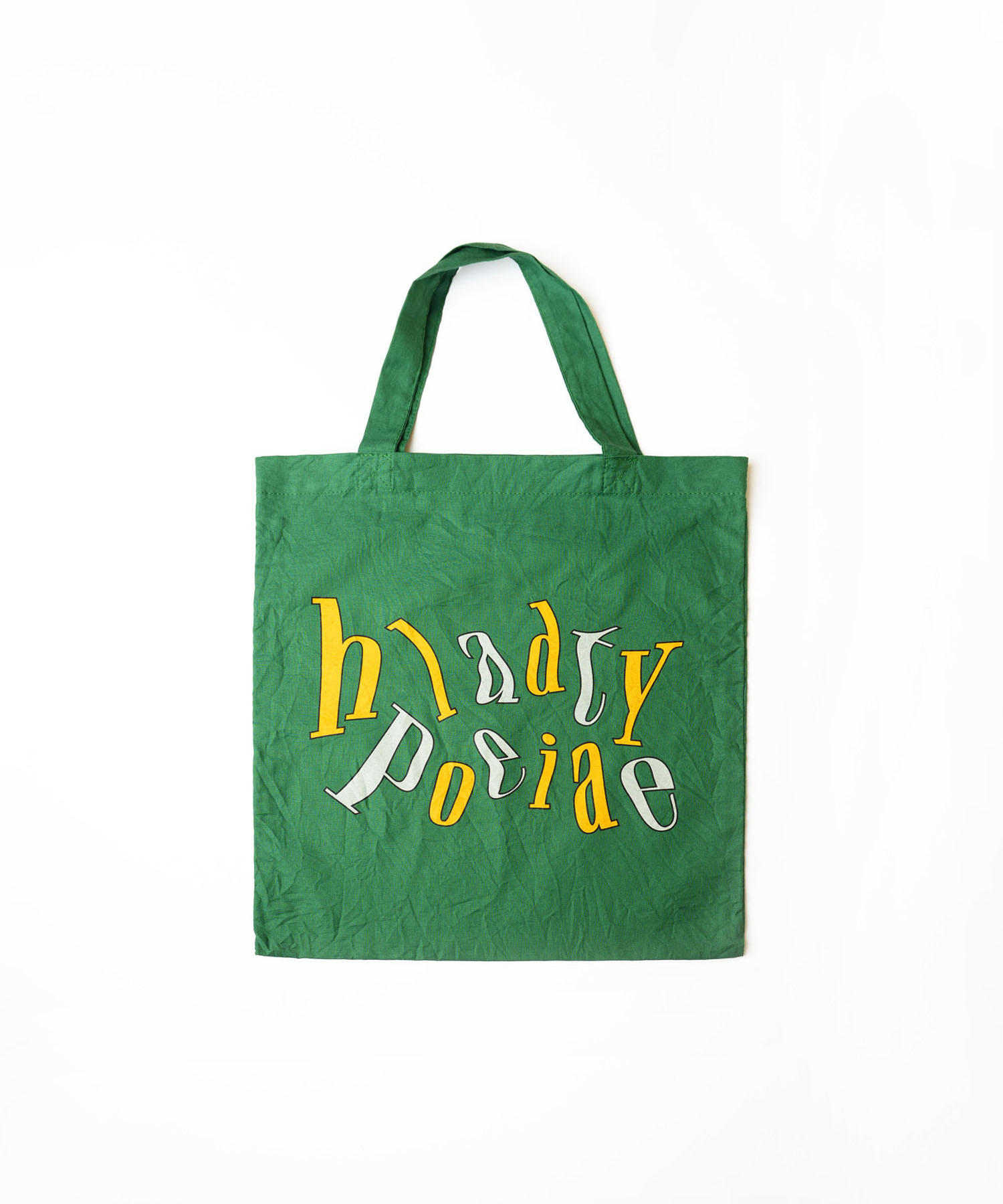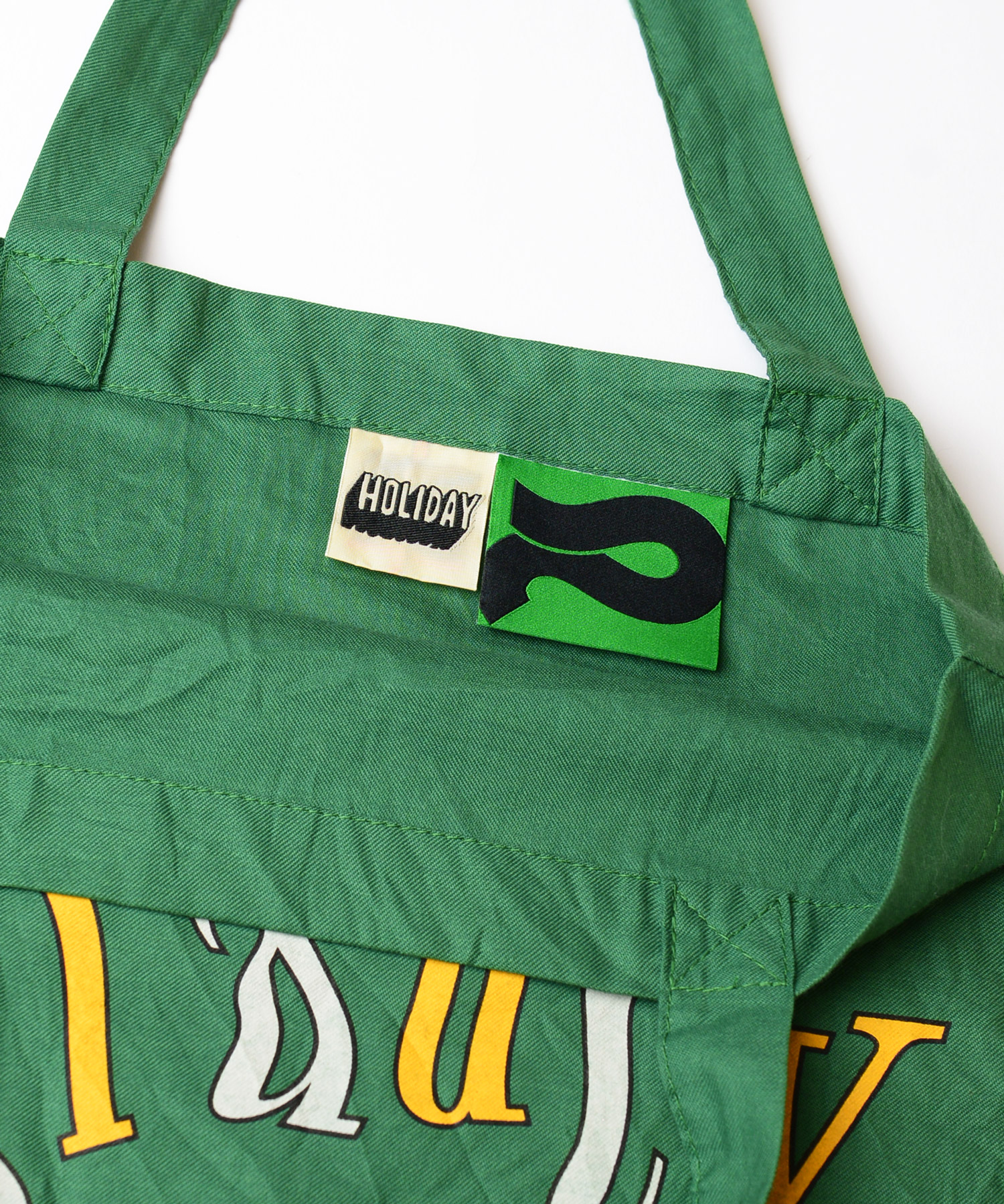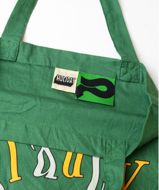 Peateデザインのグラフィックがプリントされたトートバッグ。ワンウォッシュ仕上げ。