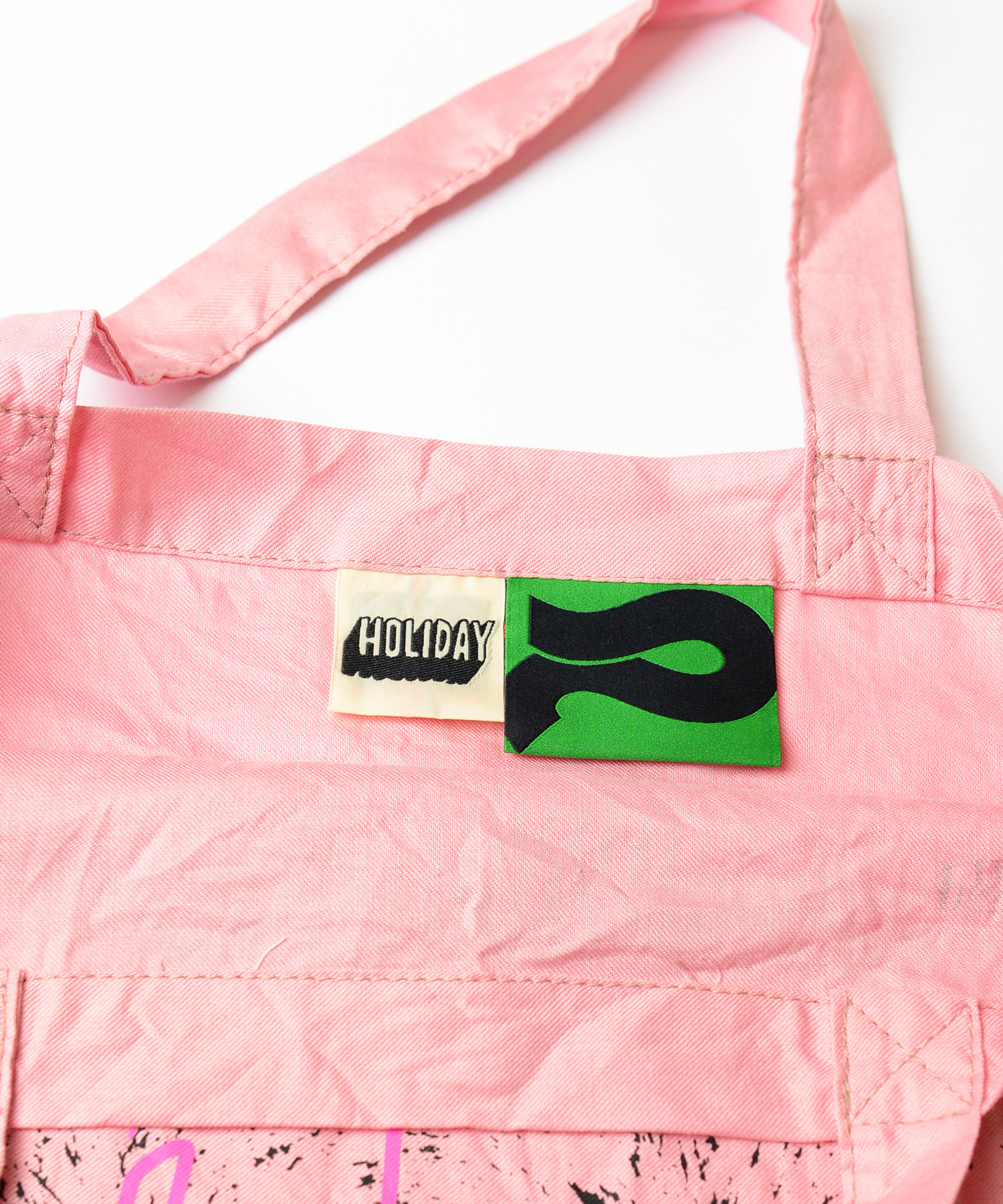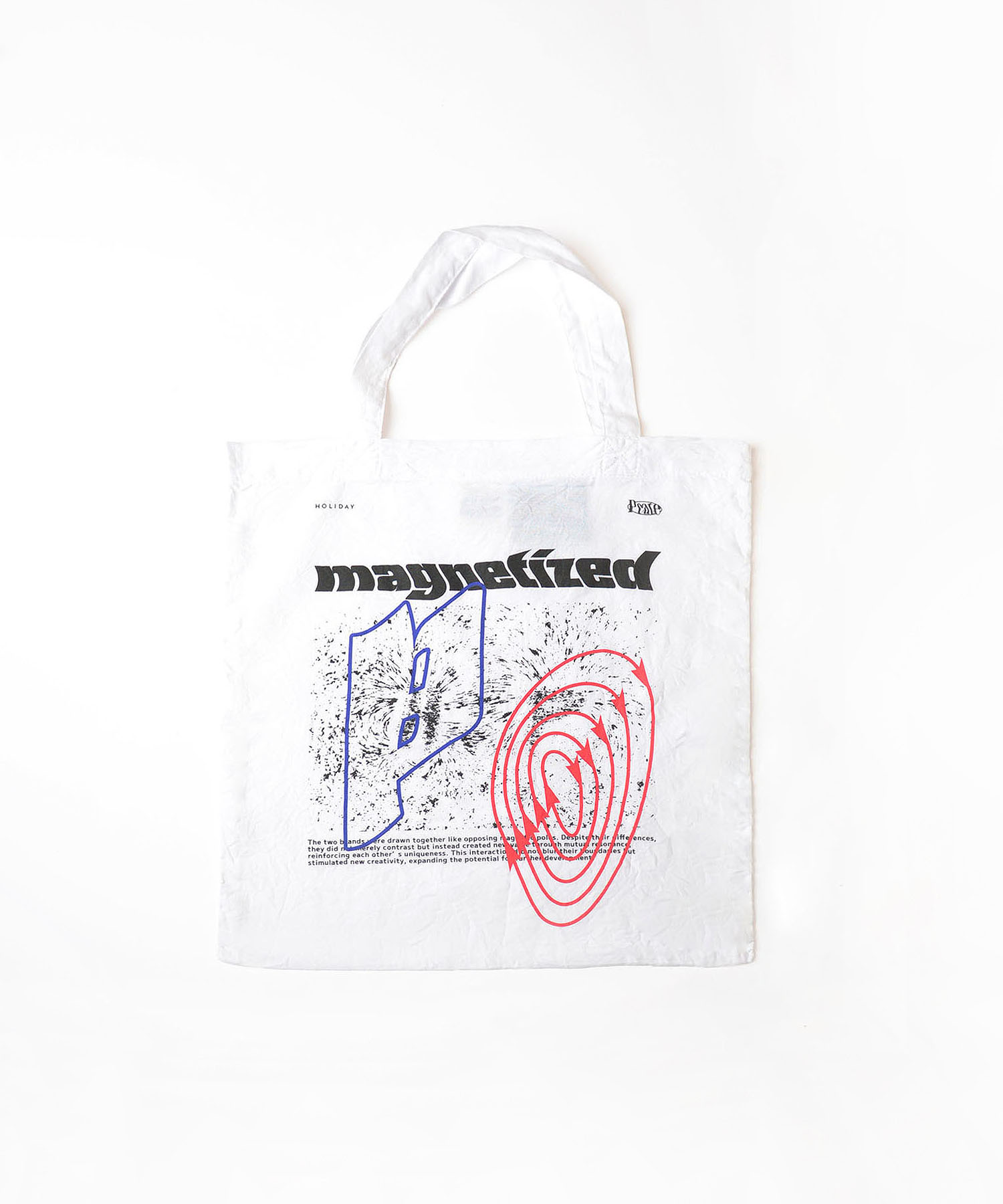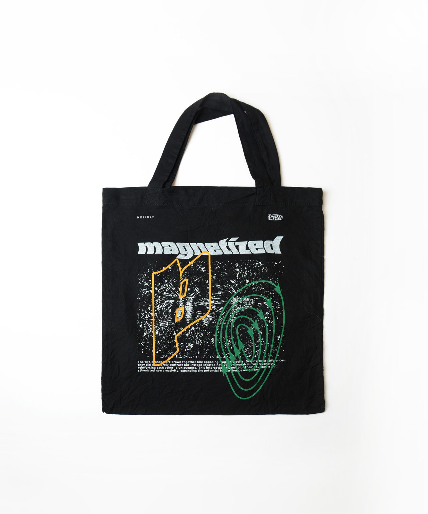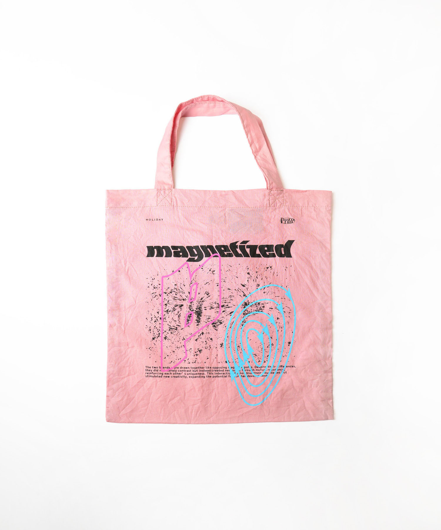 Peateデザインのグラフィックがプリントされたトートバッグ。ワンウォッシュ仕上げ。